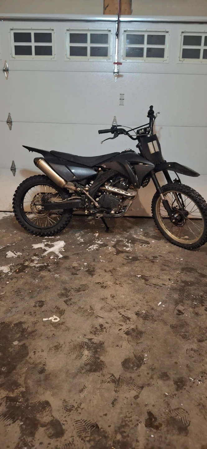 This is a black dirt bike. It's designed for off-road use. The tires have aggressive tread for traction. It's ready for your next adventure!
