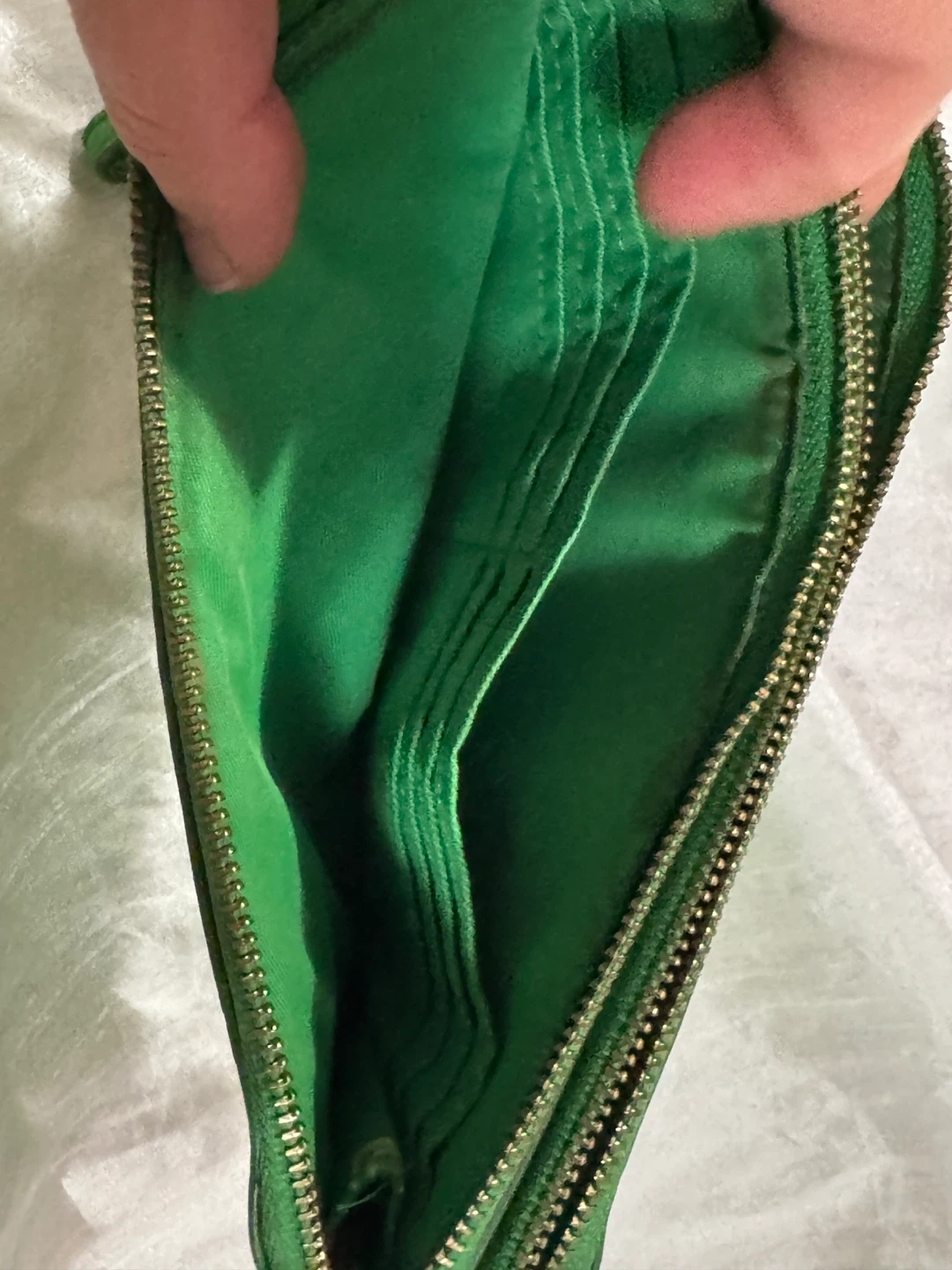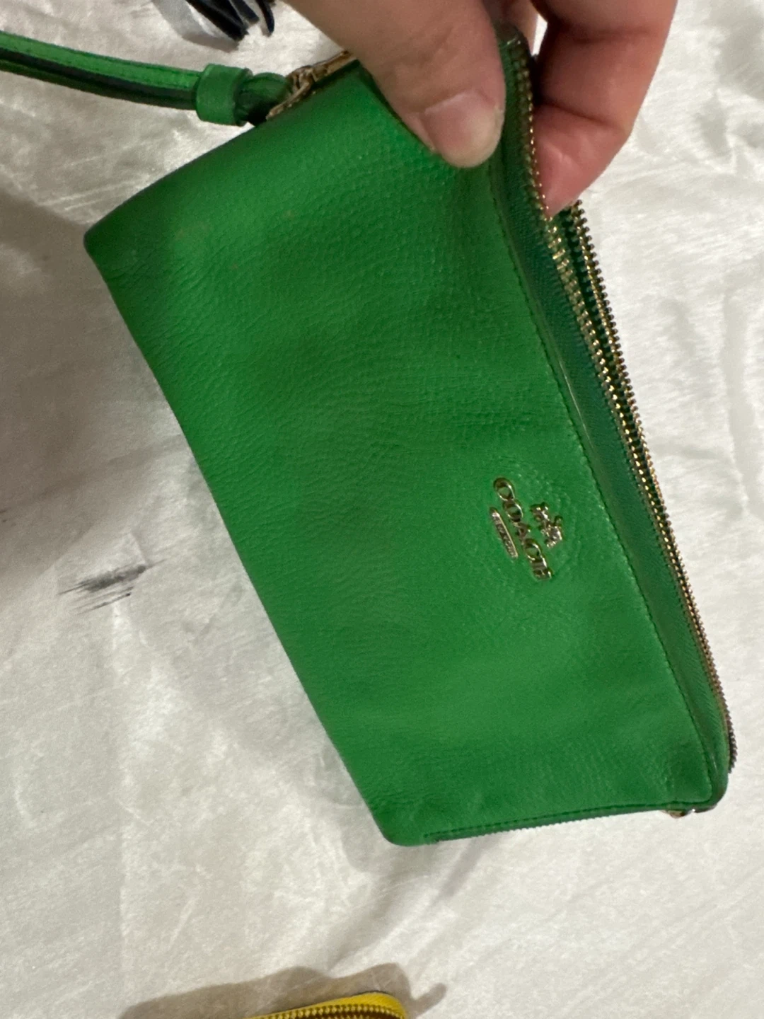 Selling a Coach wristlet wallet in a vibrant green leather! It's in good condition with some minor signs of wear. This stylish and practical accessory is perfect for keeping your essentials organized on the go. Feel free to ask any questions!