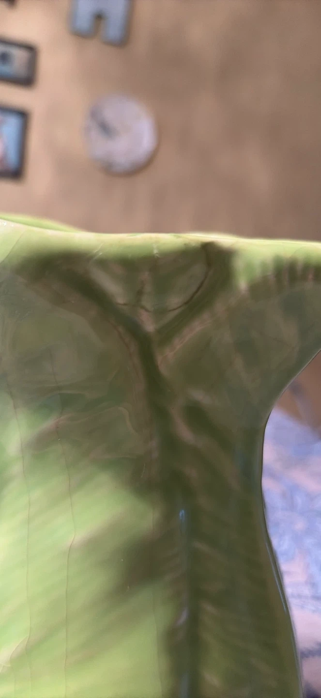 This is a bright green 1950’s ceramic pitcher with a leaf design. It's made by Olfaire in Portugal. Ceramic material. One small glued chip on the outside of the pitcher.