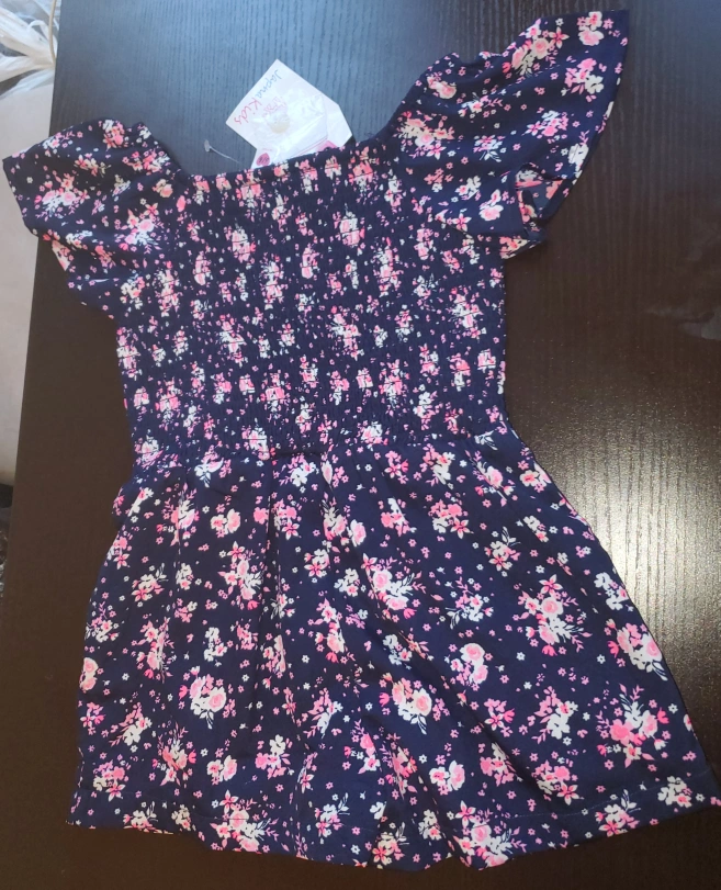*firm price* Selling a brand new floral print romper with short sleeves for kid/girls in size 5/6 for $15. Plesse note, as seen in the 4th picture, that one side of the hanger strap came off, which is minor and no one will see it. It has never been worn with the tag and extra button still attached. Unfortunately, my child grew out of it and didn't get a chance to wear this cute romper to go out.