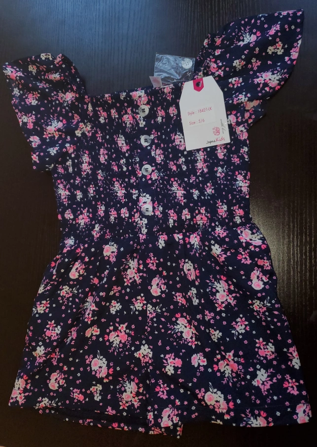 *firm price* Selling a brand new floral print romper with short sleeves for kid/girls in size 5/6 for $15. Plesse note, as seen in the 4th picture, that one side of the hanger strap came off, which is minor and no one will see it. It has never been worn with the tag and extra button still attached. Unfortunately, my child grew out of it and didn't get a chance to wear this cute romper to go out.