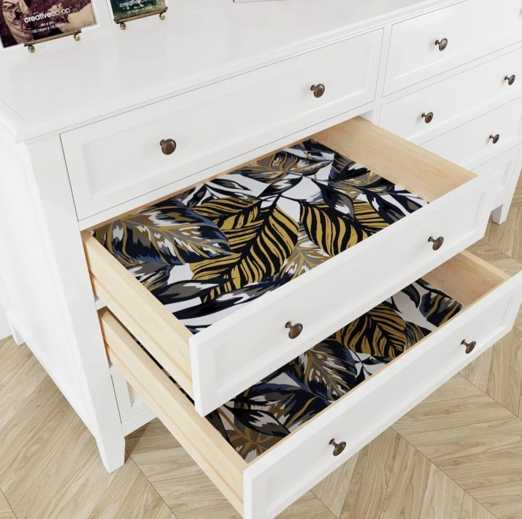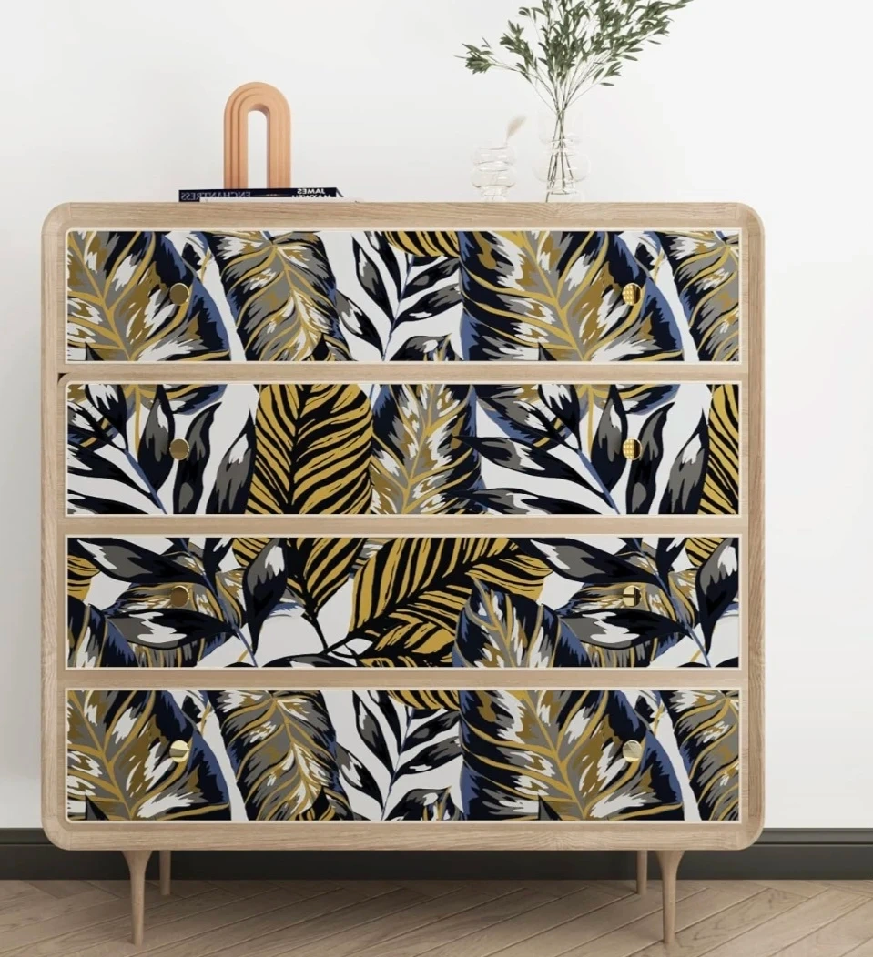 Features a vibrant tropical leaf pattern. New. 17.5" x78.7". Peel-and-stick, removable. It's a great way to add a pop of colour and texture to a room. Ideal for accent walls or furniture. Only 1 roll available.