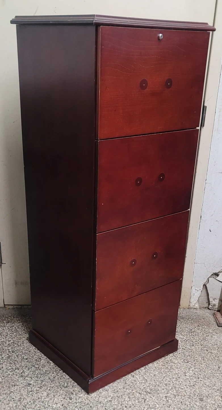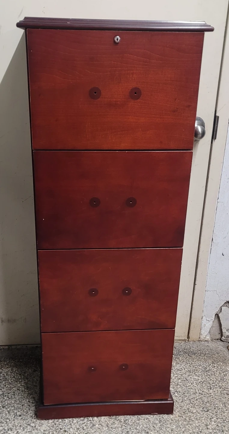 This is a cherry wood-finish four-drawer filing cabinet. It has metal drawer slides for smooth operation. The cabinet also features a lock with a key for security.