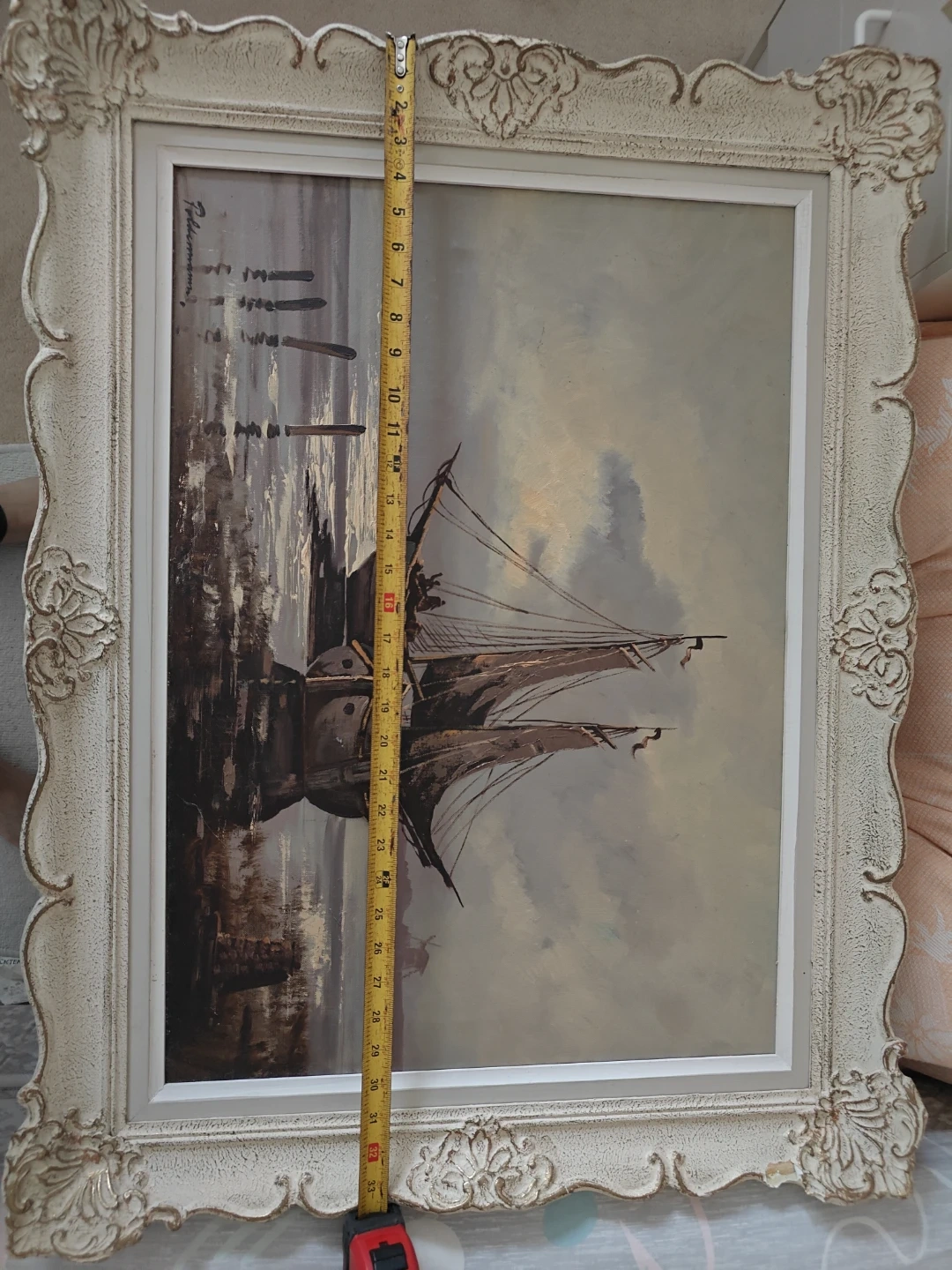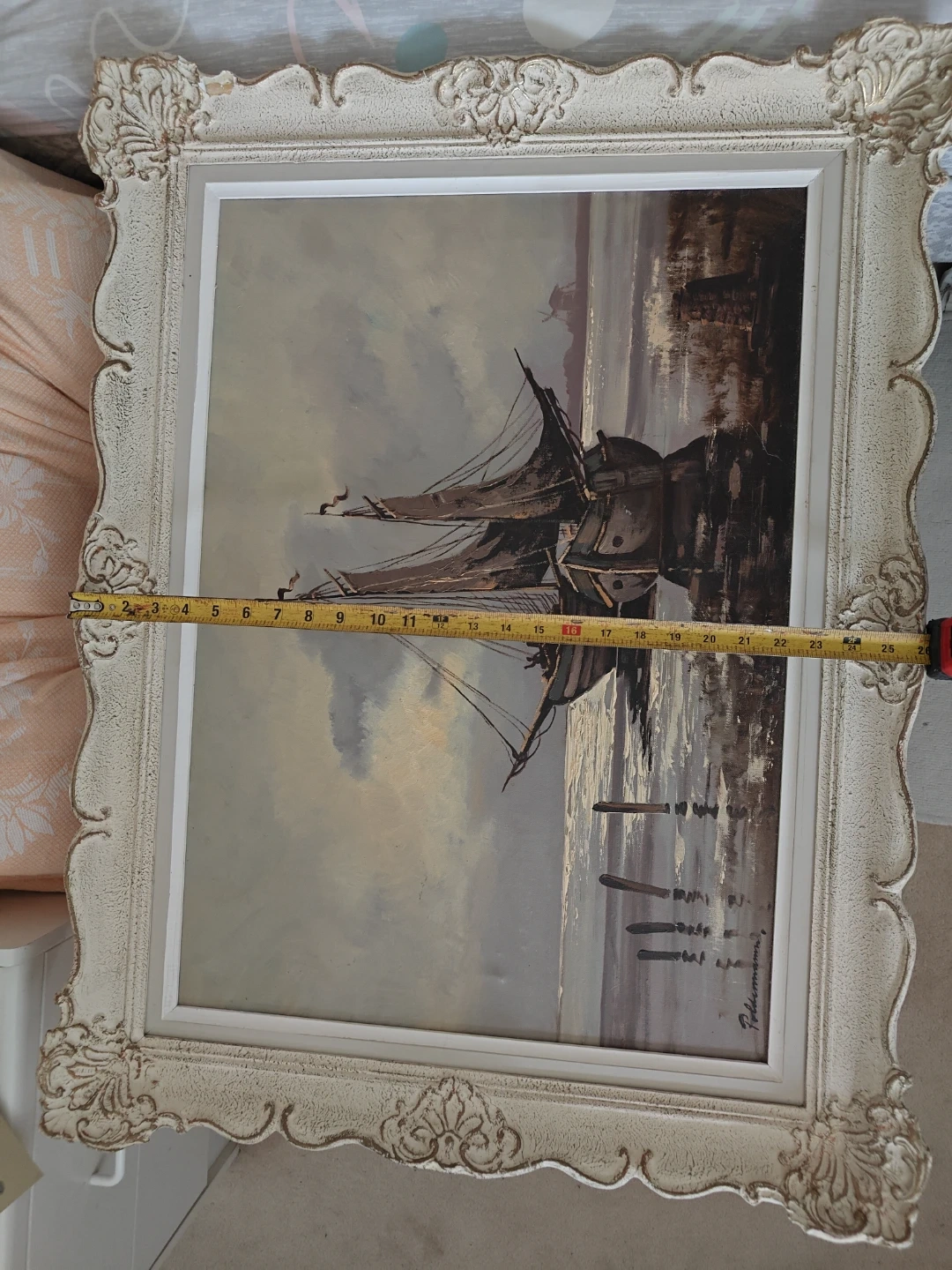 This is a framed painting of a sailing ship. The frame has an ornate, vintage-style design. The painting itself depicts a ship at sea under a cloudy sky. It would make a great addition to any room!