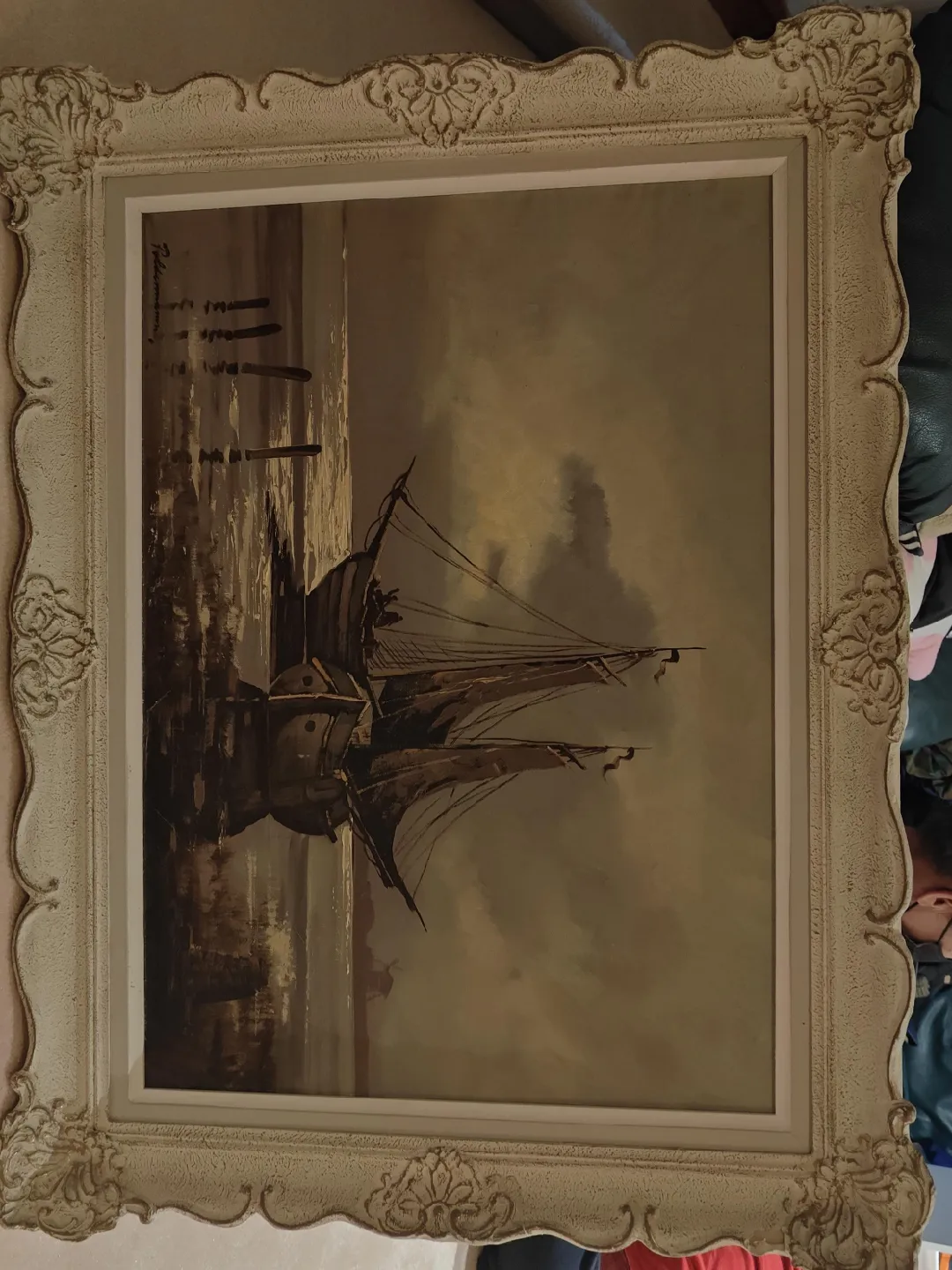 This is a framed painting of a sailing ship. The frame has an ornate, vintage-style design. The painting itself depicts a ship at sea under a cloudy sky. It would make a great addition to any room!