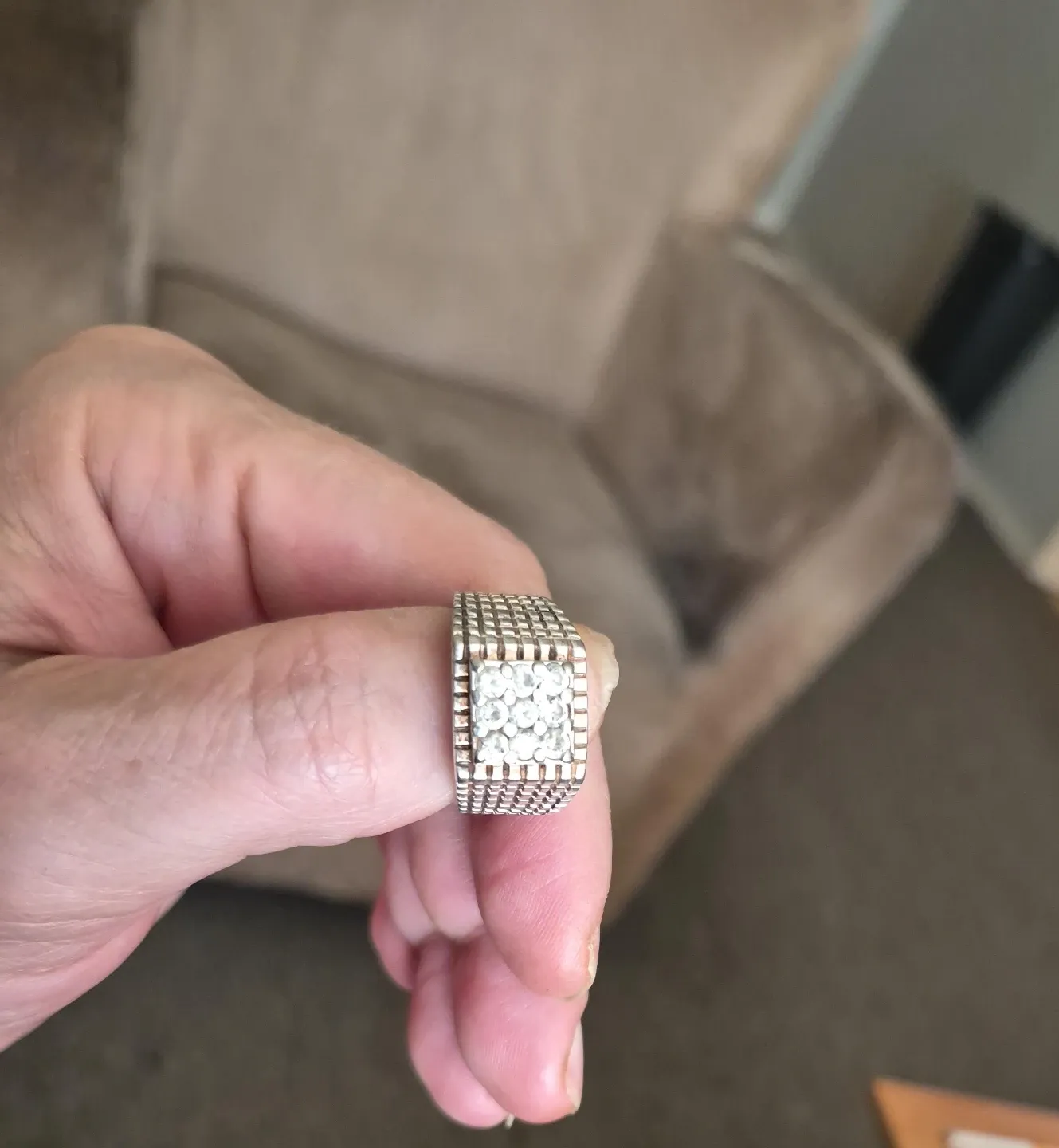 This is a men's signet ring with a square face. It features clear stones set in a grid pattern on the face and a textured band. The metal appears to be silver-toned.