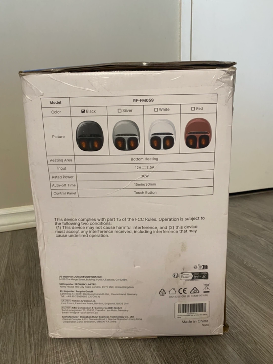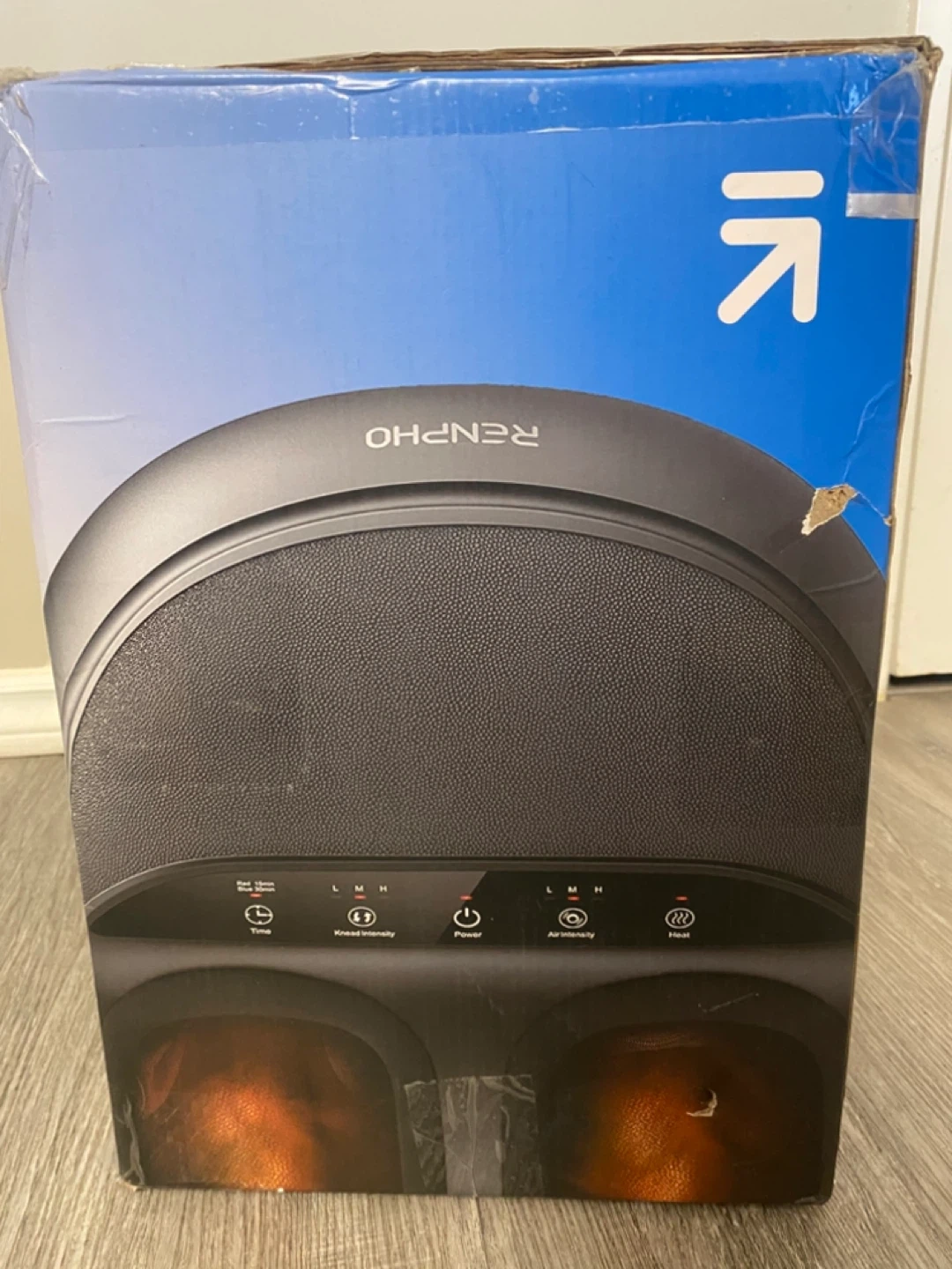 New in box Renpho Shiatsu Foot Massager, model RF-FM059 in black. This massager has shiatsu massage on pressure points and a heating function for instant relaxation. It offers 3 levels of kneading intensity and has a 15 or 30 minute auto-off timer. Control panel has touch buttons. Used once to check it’s working and It's still in the original box, box has some wear and tear from storage.