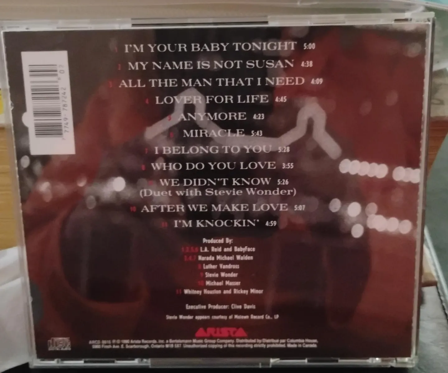 This is Whitney Houston's 'I'm Your Baby Tonight' CD. It features 10 tracks, including a duet with Stevie Wonder. Produced by L.A. Reid, BabyFace, and others.
