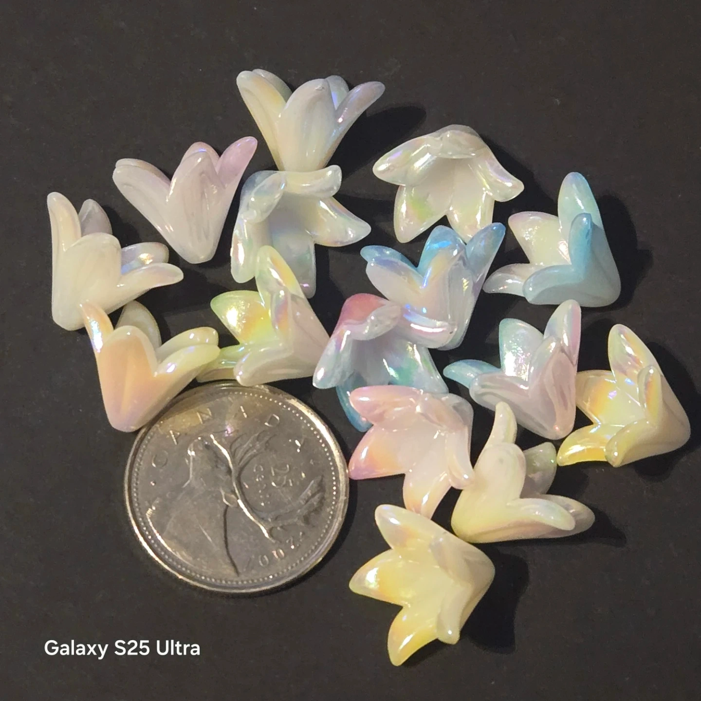 These are some iridescent flower beads! They're perfect for crafts or jewelry making. The colours shift depending on the light, so they're really pretty and unique