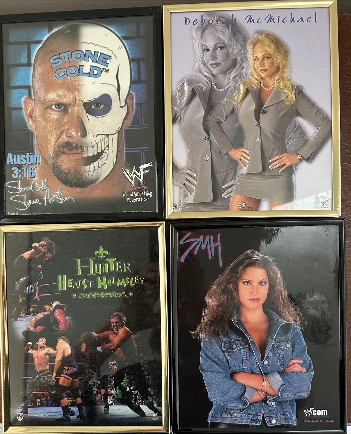 Four framed photos featuring WWF wrestling stars. Includes Stone Cold Steve Austin, Deborah McMichael, Hunter Hearst Helmsley, and SMH. These are great for any wrestling fan's collection! $10 each or $30 for ALL!