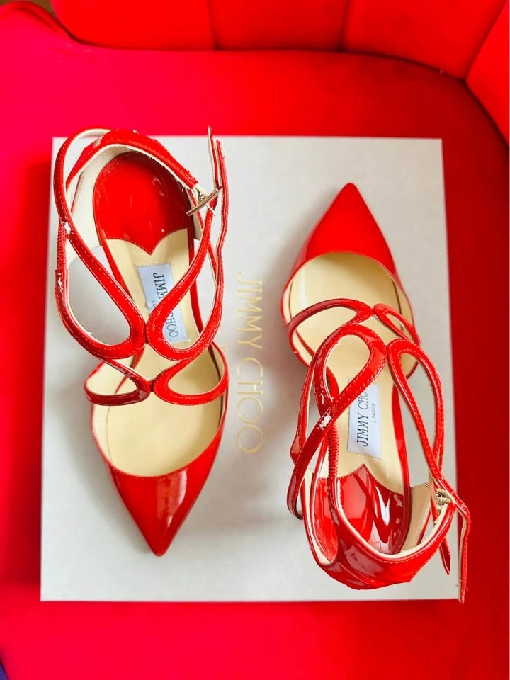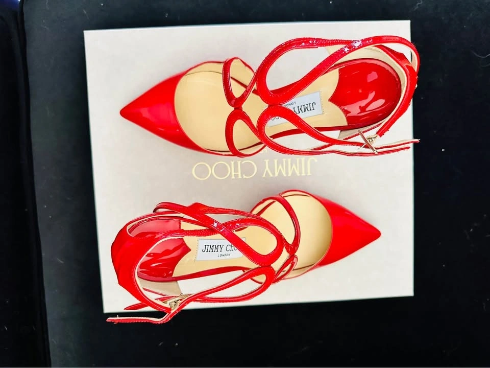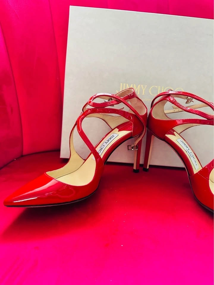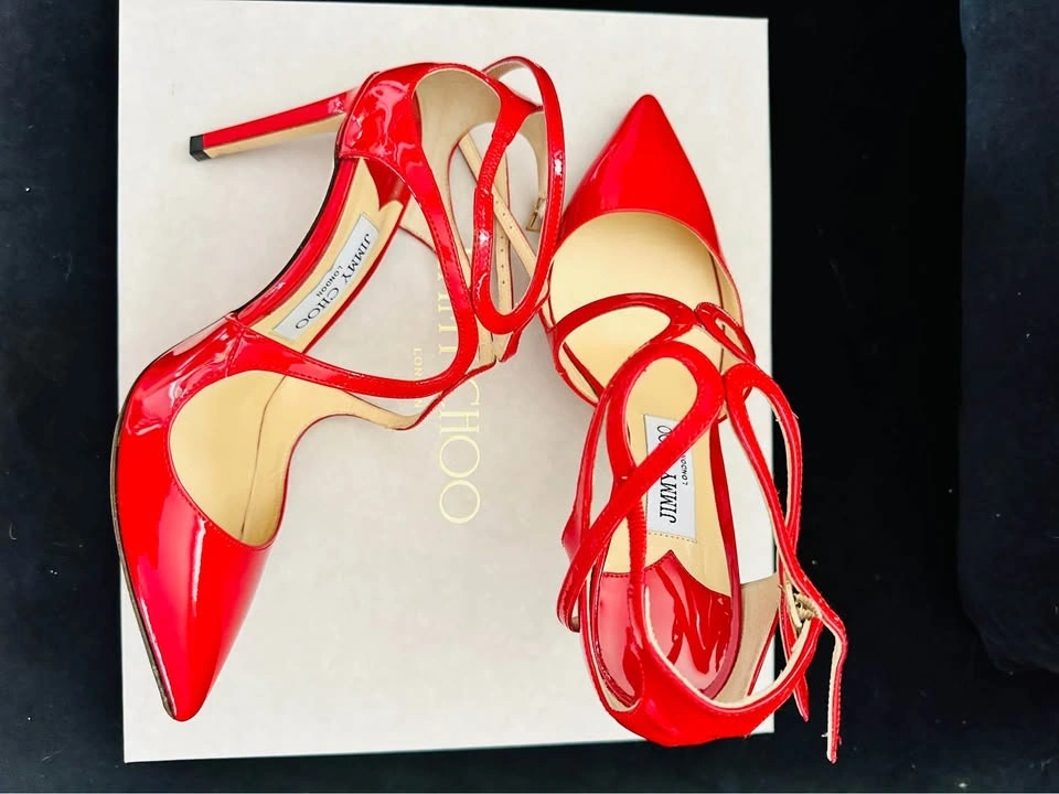 Authentic Jimmy Choo red patent leather heels. Worn only 1–2 times, includes the original box. Excellent condition with an elegant strappy design. These are very eye-catching and perfect for events or parties. Size 37. Selling because I don’t wear heels often. Pickup in Markham.