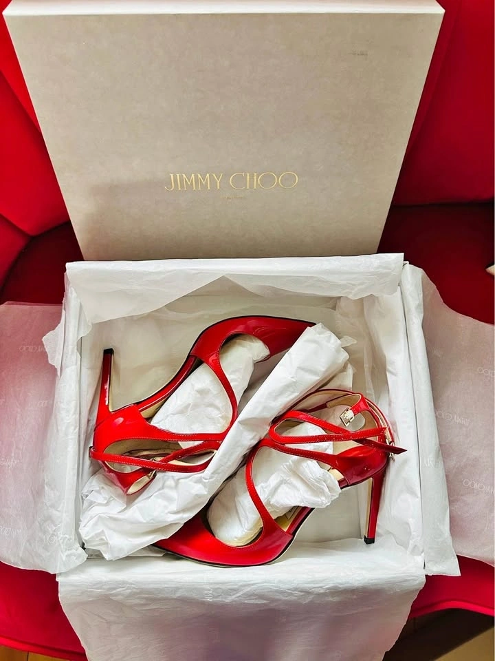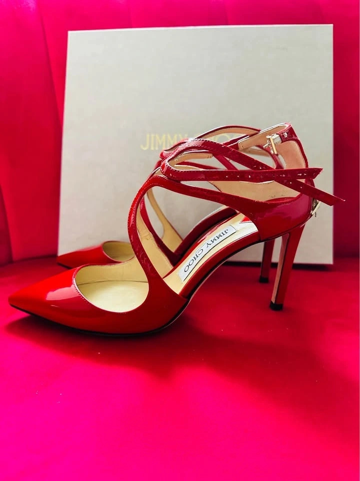 Authentic Jimmy Choo red patent leather heels. Worn only 1–2 times, includes the original box. Excellent condition with an elegant strappy design. These are very eye-catching and perfect for events or parties. Size 37. Selling because I don’t wear heels often. Pickup in Markham.