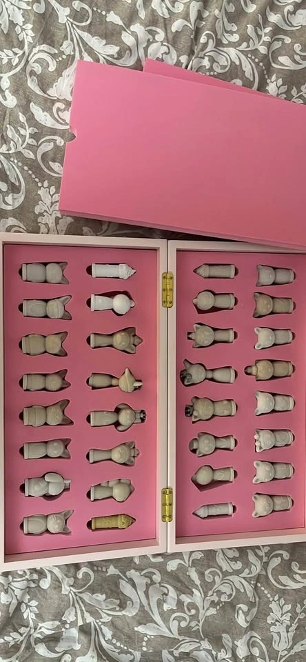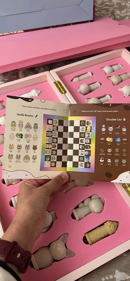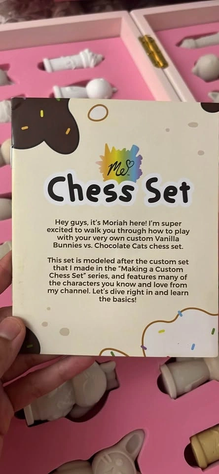 The Moriah Elizabeth Chess Set is an official, hand-painted collector's item featuring custom-molded characters from her YouTube channel, designed as a battle between "Vanilla Bunnies" and "Chocolate Cats". Developed with Juniper Creates, the set includes 32 detailed pieces and a foldable board. Never used, just sitting in my closet. Comes in a really sturdy briefcase.