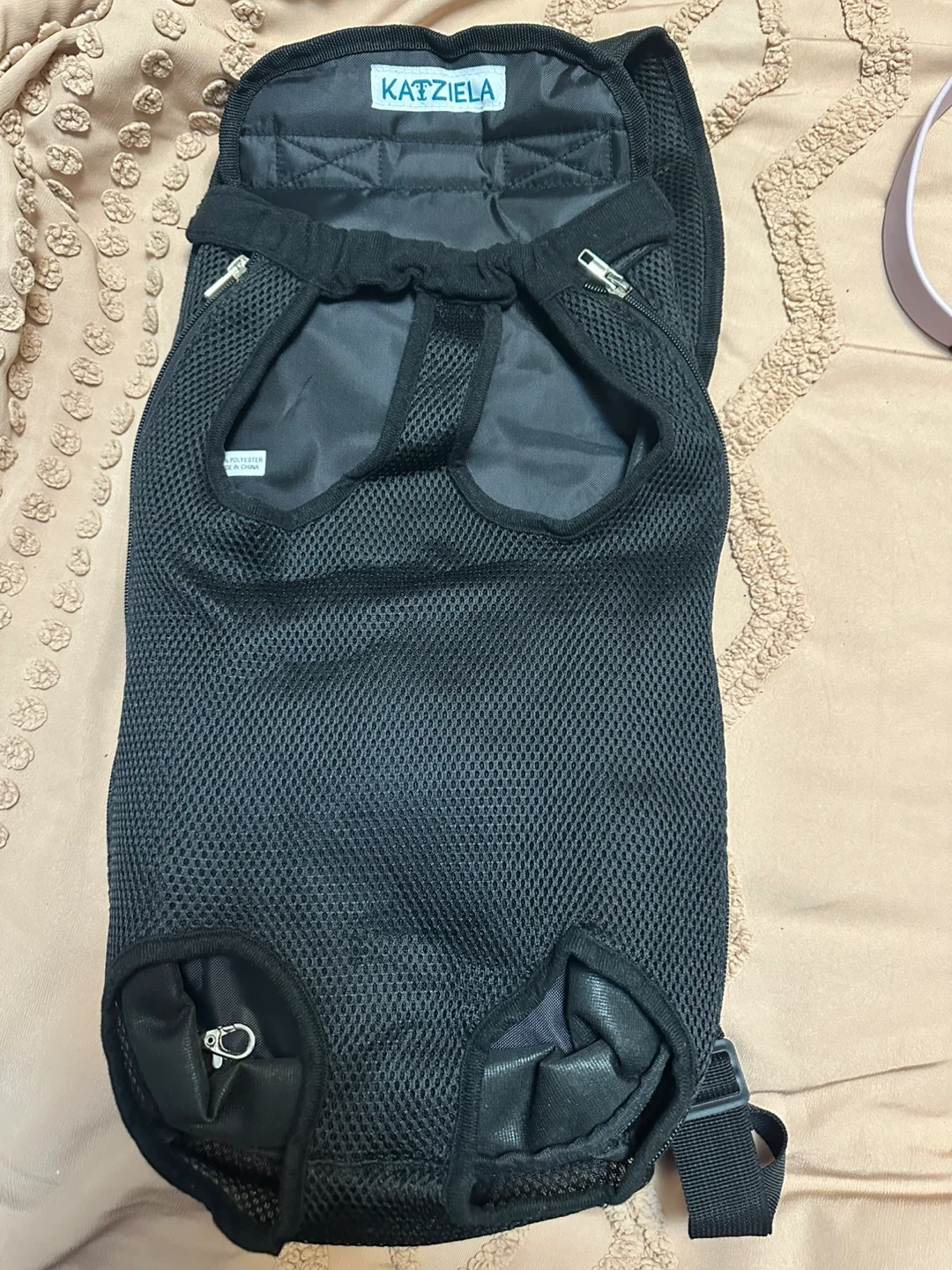 Black Katziela pet carrier backpack. Made with breathable mesh material. Includes adjustable straps for comfort. It has openings for your pet's head and tail.