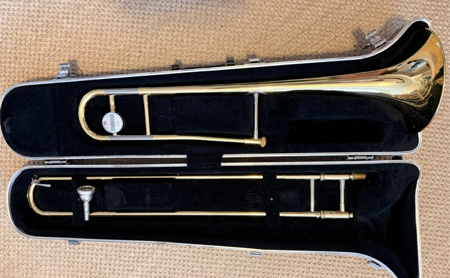 Yamaha YSL-354 trombone with mouthpiece and hard case. Everything is in good condition, the slide moves smoothly, and it plays beautifully. There are a few minor surface scratches.