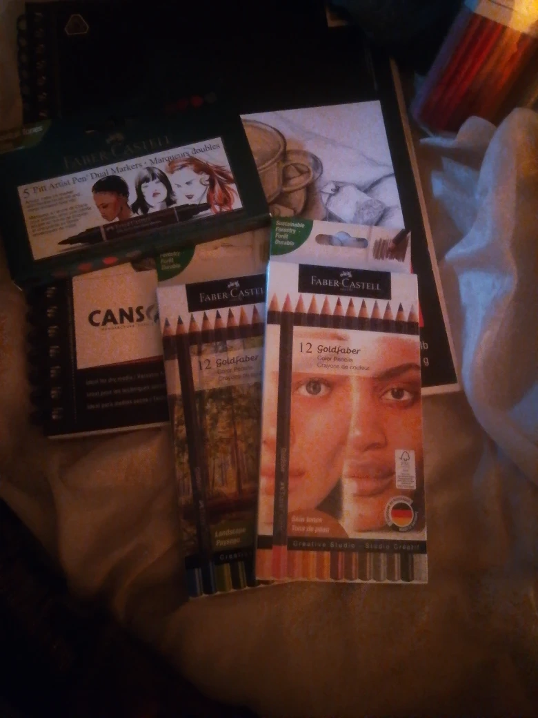 15Selling a collection of art supplies from Faber-Castell and Canson! Included are: - Faber-Castell 5 Pitt Artist Pen Dual Markers - Faber-Castell 12 Goldfaber Colour Pencils x 2 - Canson Sketchbook