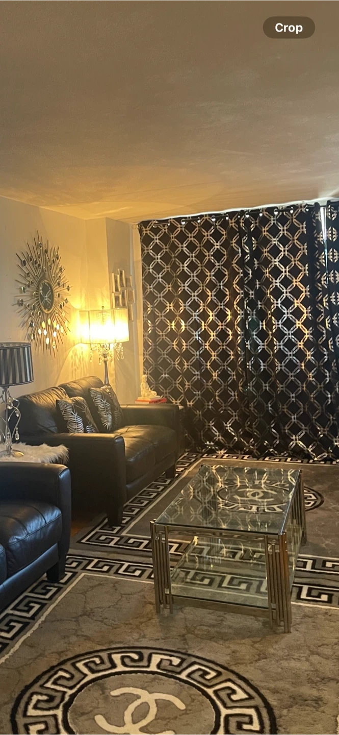 A stylish coffee table with a clear glass top and a lower shelf. It features a gleaming chrome frame with decorative vertical accents. This table adds a modern touch to any living space.