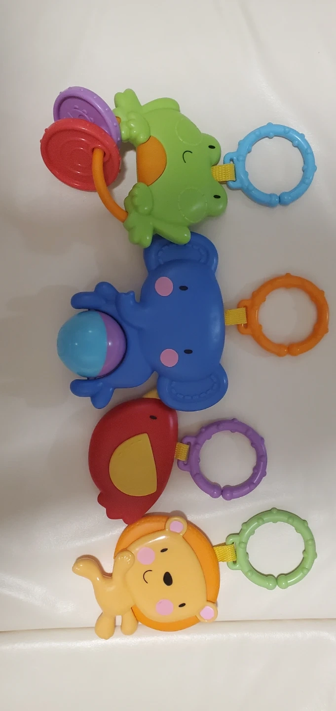 This colourful baby rattle features four animal characters: a frog, an elephant, a bird, and a lion. Each character has a ring for easy attachment. It's made of plastic and designed for little hands to grasp and shake.