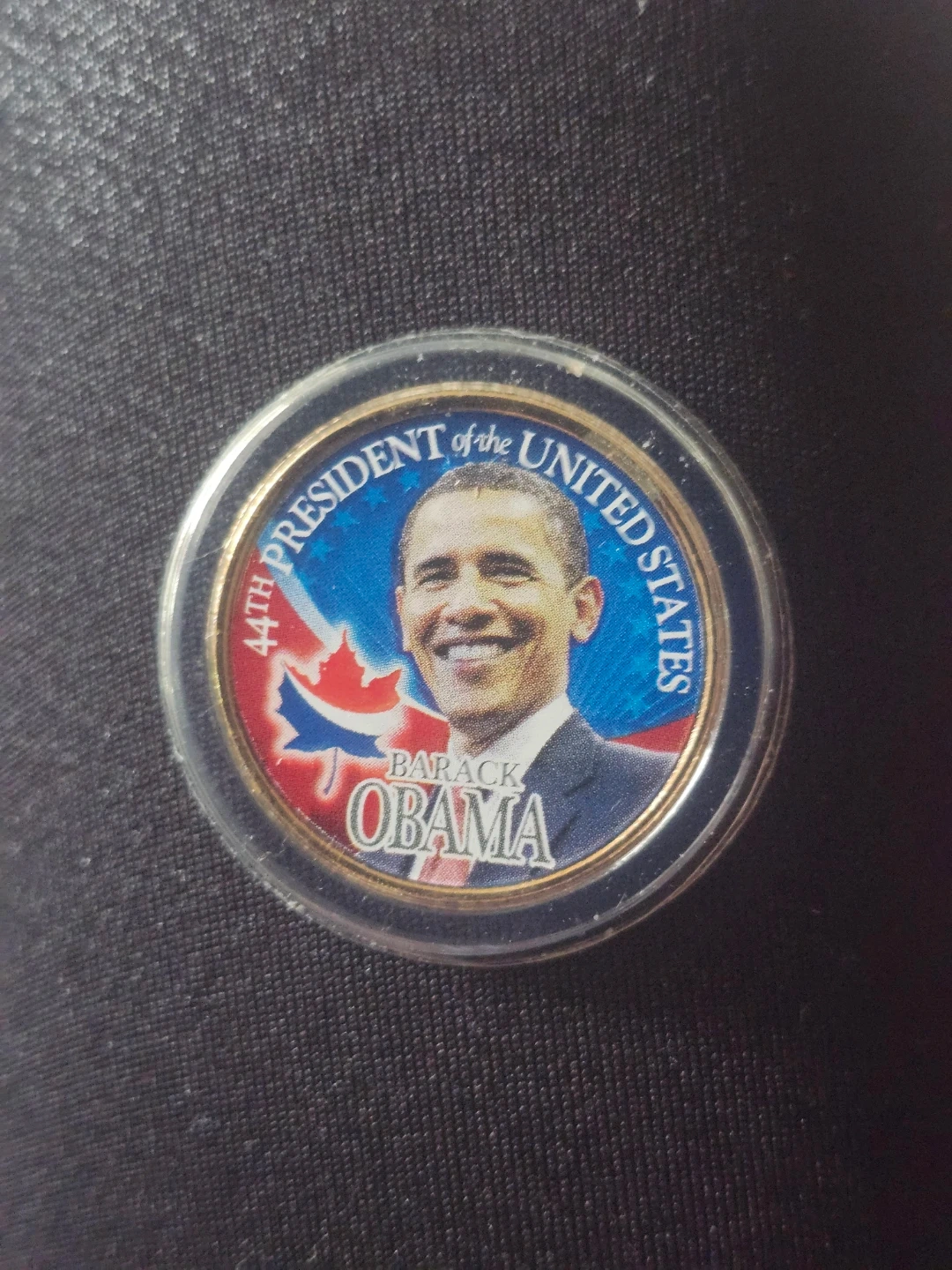 This is a Canadian-American Gold Commemorative featuring Barack Obama. It's a genuine maple leaf medallion manufactured by the Royal Canadian Mint. The full colour portrait is achieved with a special colourizing technique. It's layered in pure 24 Karat Gold.