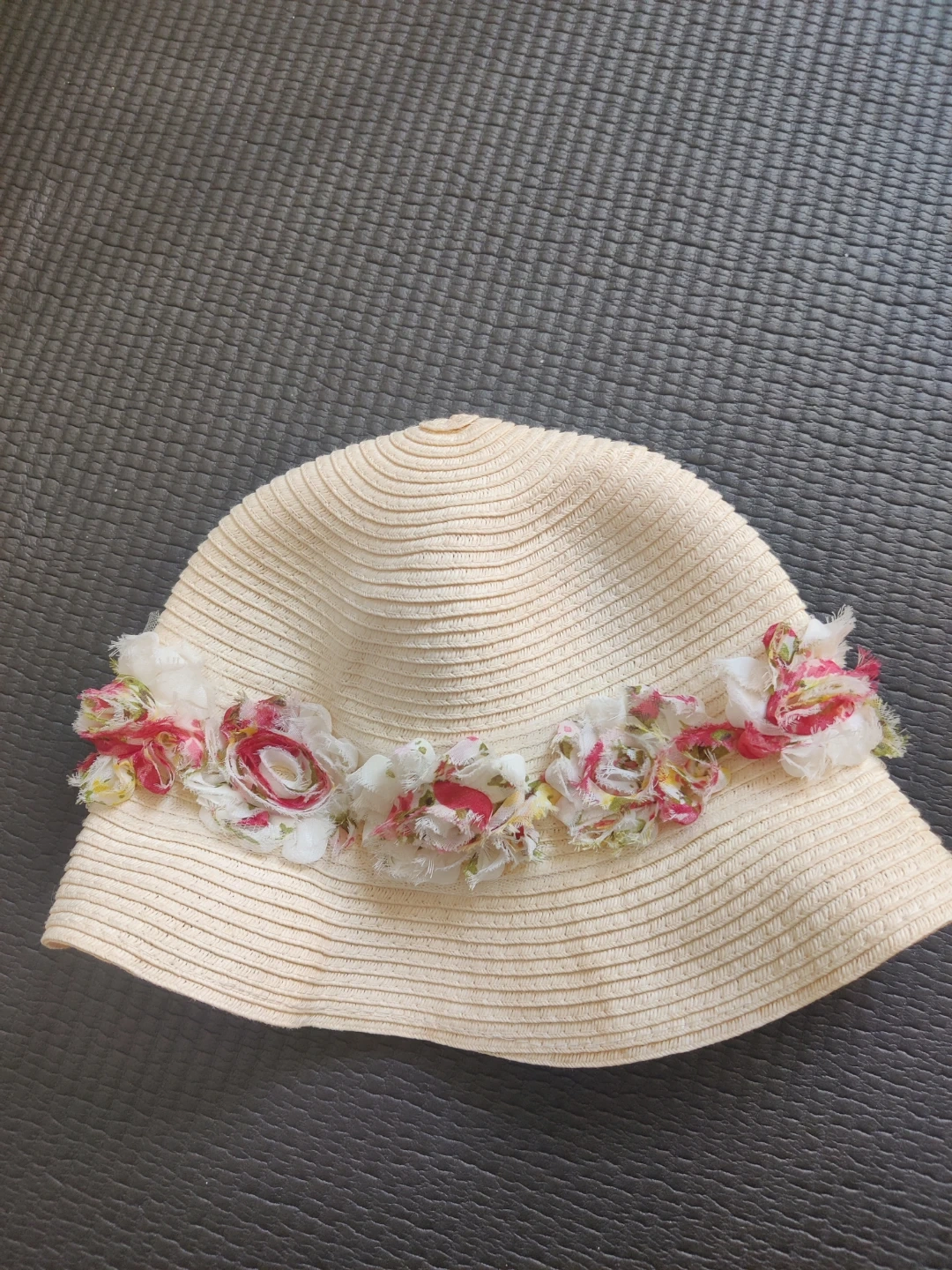 Cream straw sun hat decorated with fabric flowers and ribbon trim. The inner circumference measures approximately 21 inches. It's a lovely accessory for sunny days!