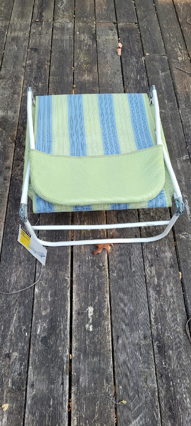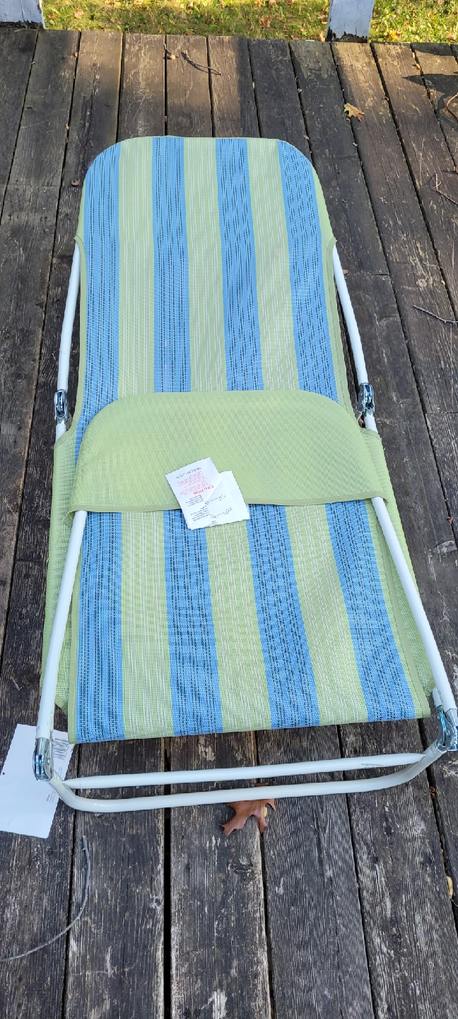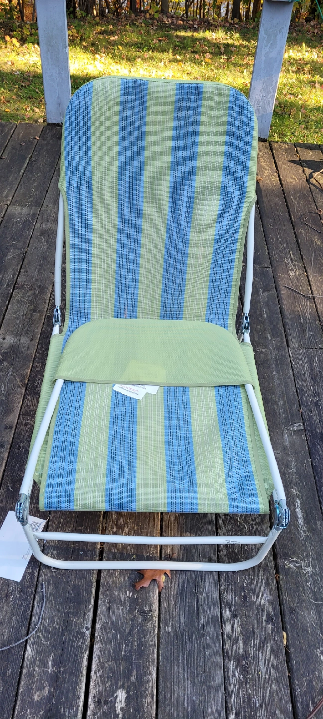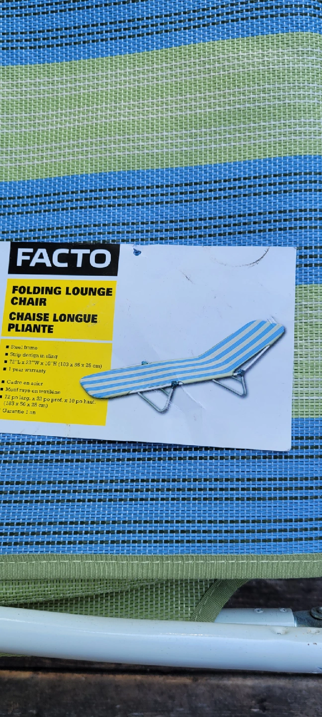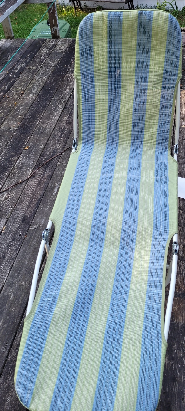 Here’s a Facto folding lounge chair in a refreshing blue and green stripe! It's perfect for relaxing outdoors. The frame is steel and the chair measures approximately 23"W x 55"L x 14"H (103 x 35 x 58 cm) when open I have 2 available one used a few times other never used brand new.