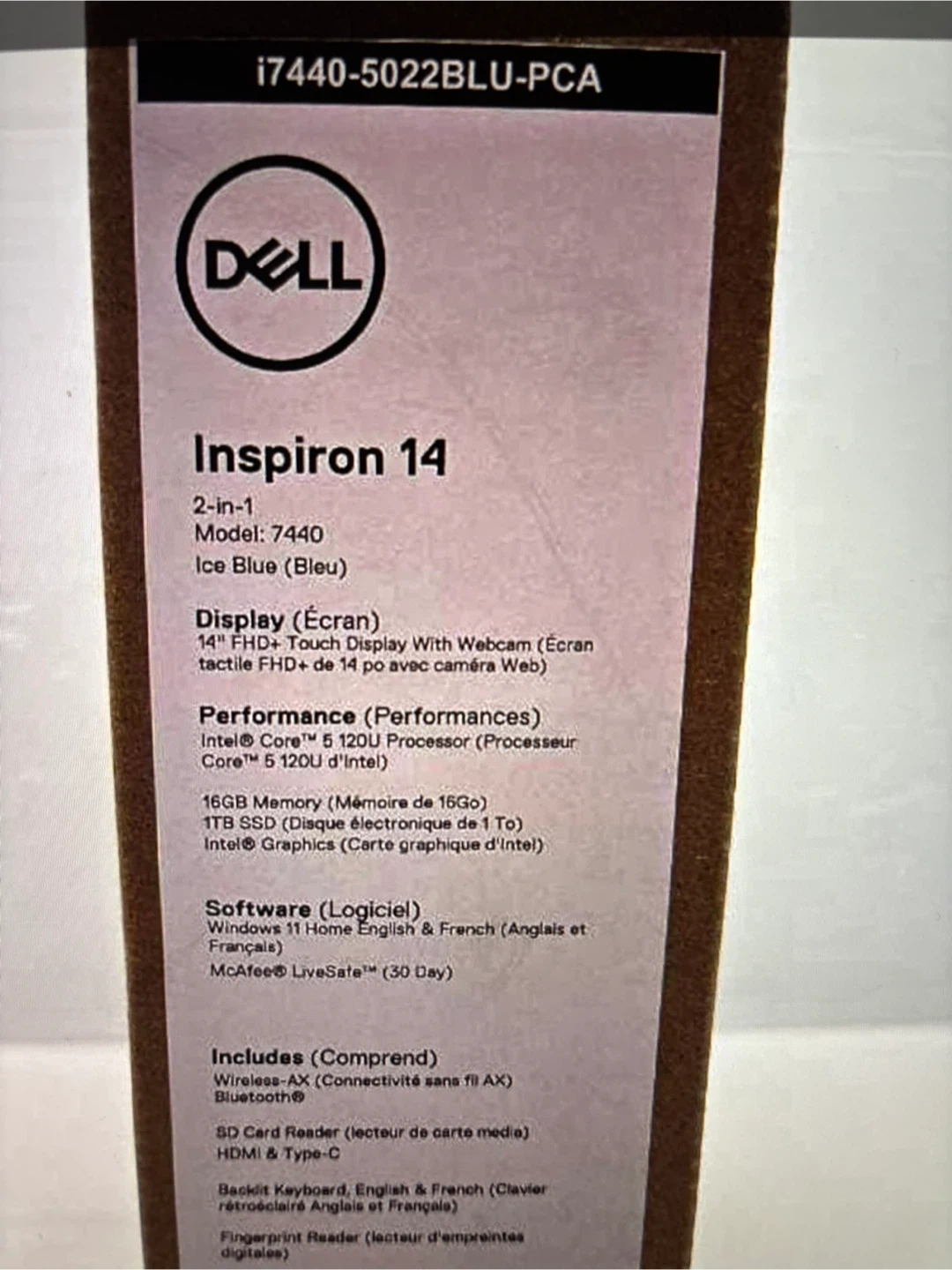 60Selling Brand New Factory Sealed Dell Inspiron 14 7440 2-in-1 laptop in Ice Blue! It's a versatile 2-in-1, perfect for work or play. Key features: - 14" FHD+ Touch Display with Webcam - Intel Core i5 120U Processor - 16GB Memory - 1TB SSD It also includes Wireless-AX, Bluetooth, SD Card Reader, HDMI & Type-C ports. Comes with the original box!