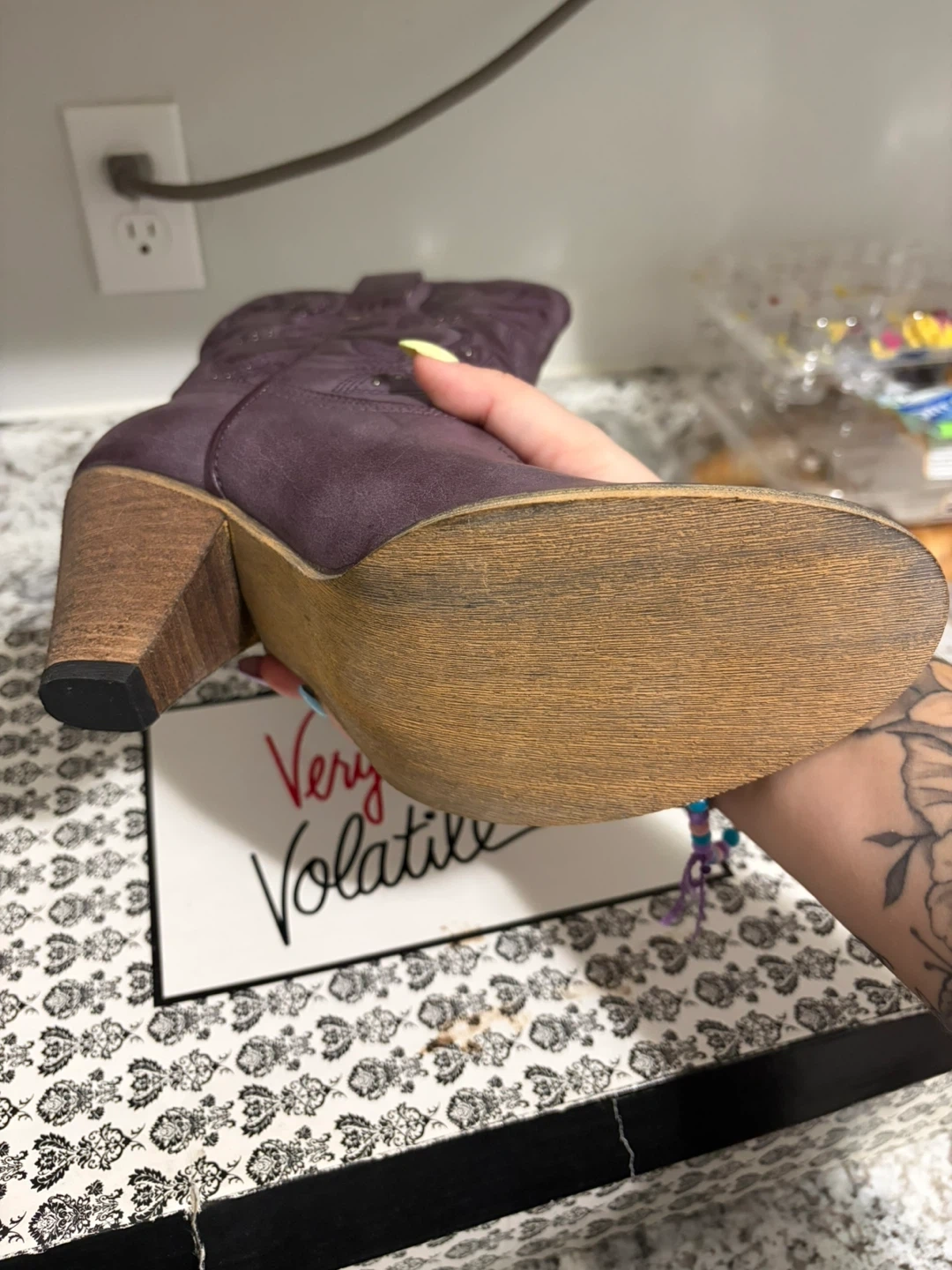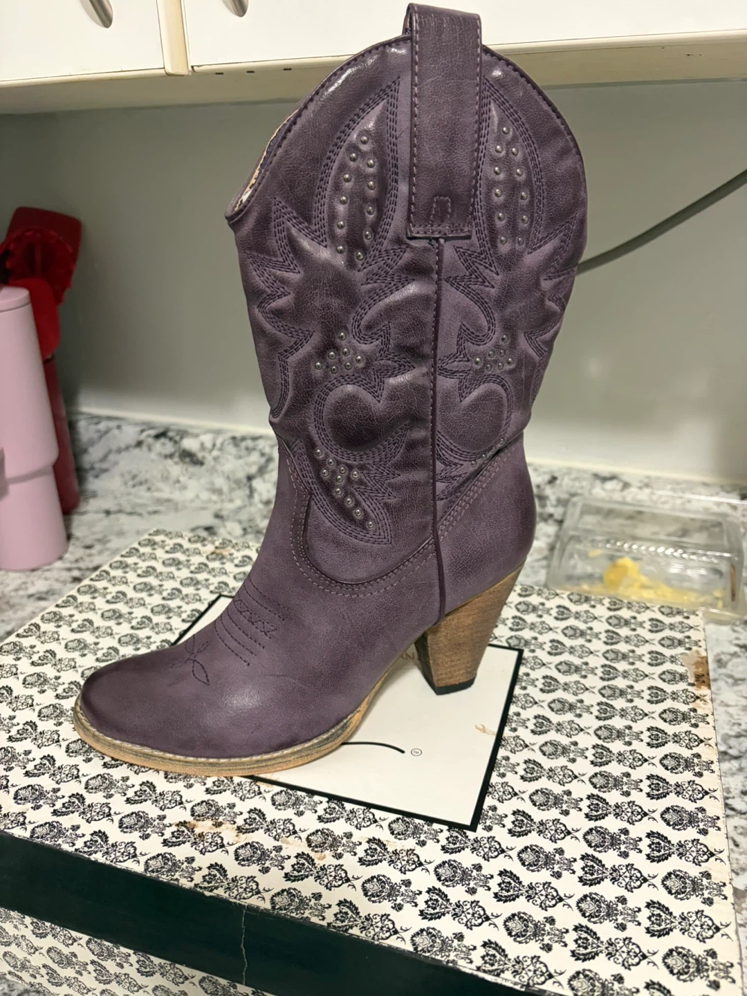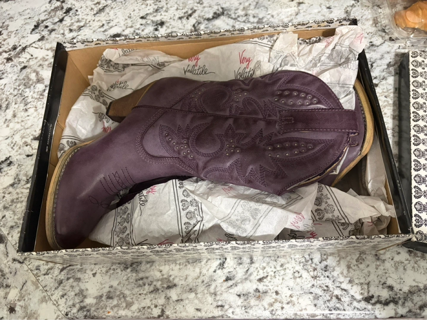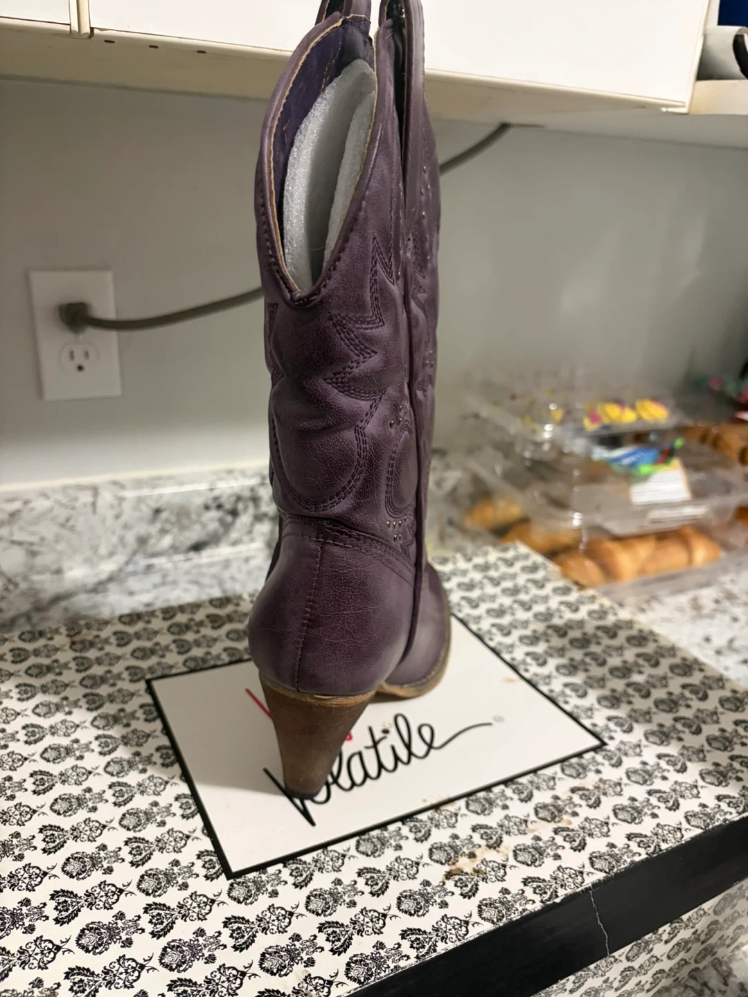 NEW! Very Volatile Denver cowboy boots in a size 8. These boots are purple and feature a decorative stitched pattern with stud accents. They have a classic cowboy boot silhouette with a stacked heel.