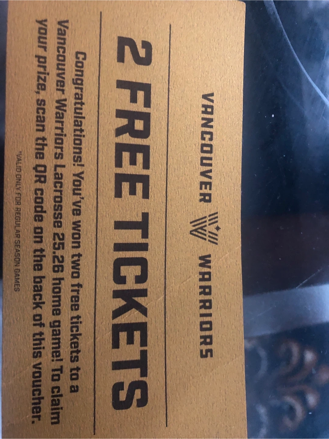 Congratulations, you've won two free tickets to a Vancouver Warriors Lacrosse 25.26 home game! To claim your prize, scan the QR code on the back of this voucher. Valid only for regular season games.