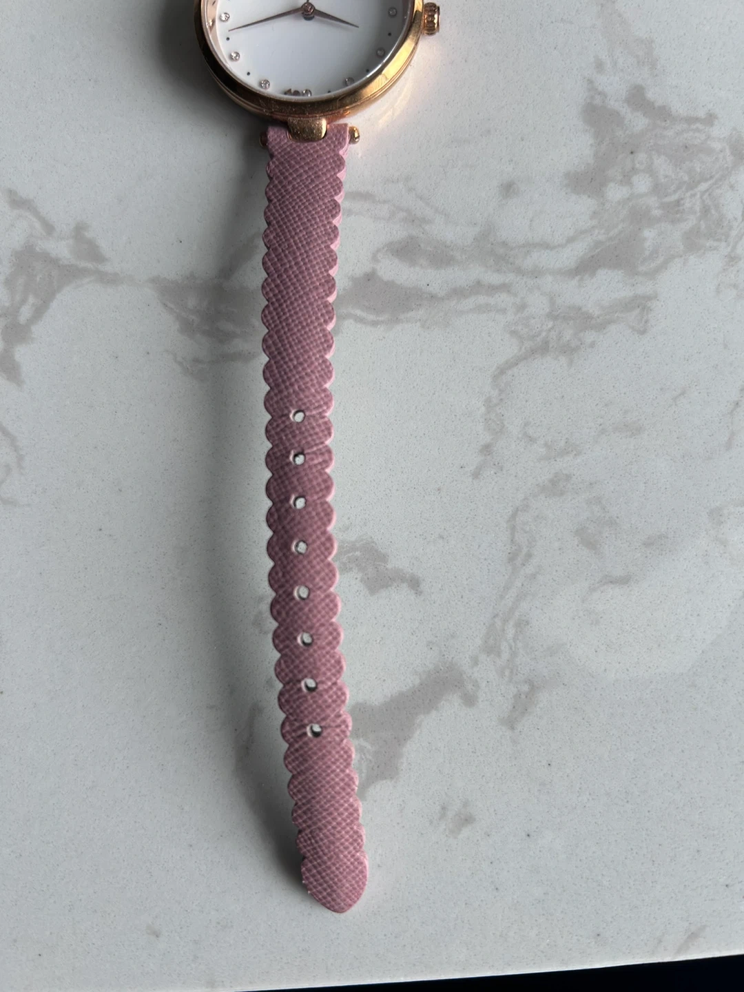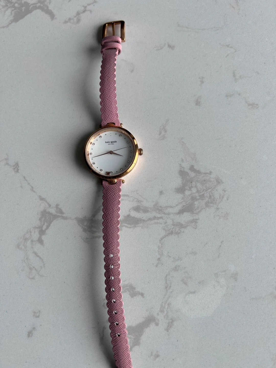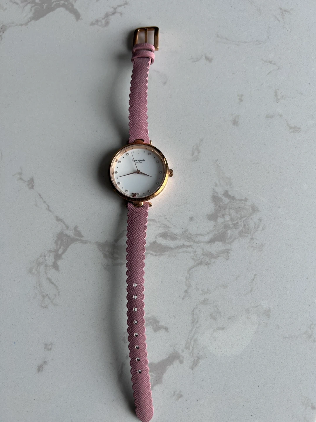 This is a Kate Spade watch with a white face and rose gold-toned case. It has a pink, scalloped faux leather strap. It's a stylish accessory for everyday wear.