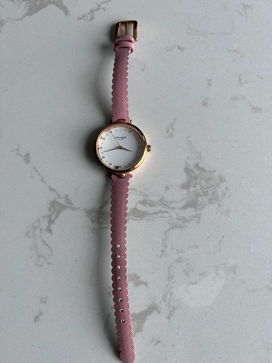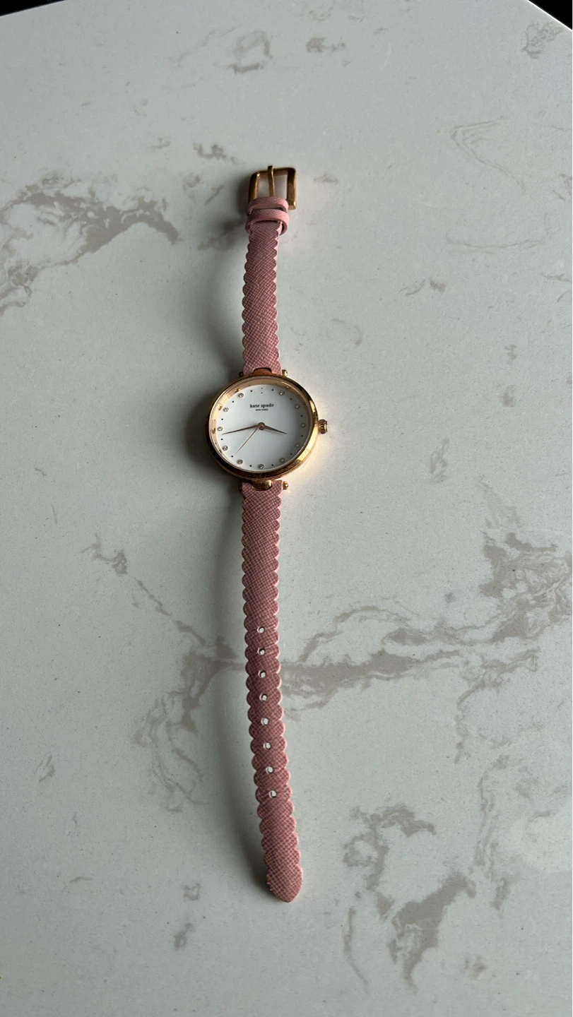 This is a Kate Spade watch with a white face and rose gold-toned case. It has a pink, scalloped faux leather strap. It's a stylish accessory for everyday wear.