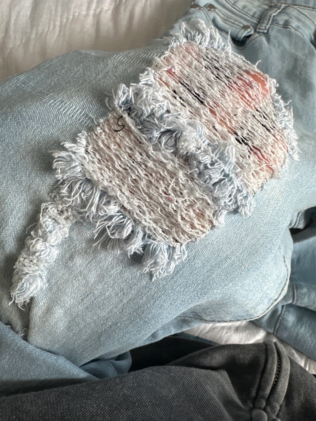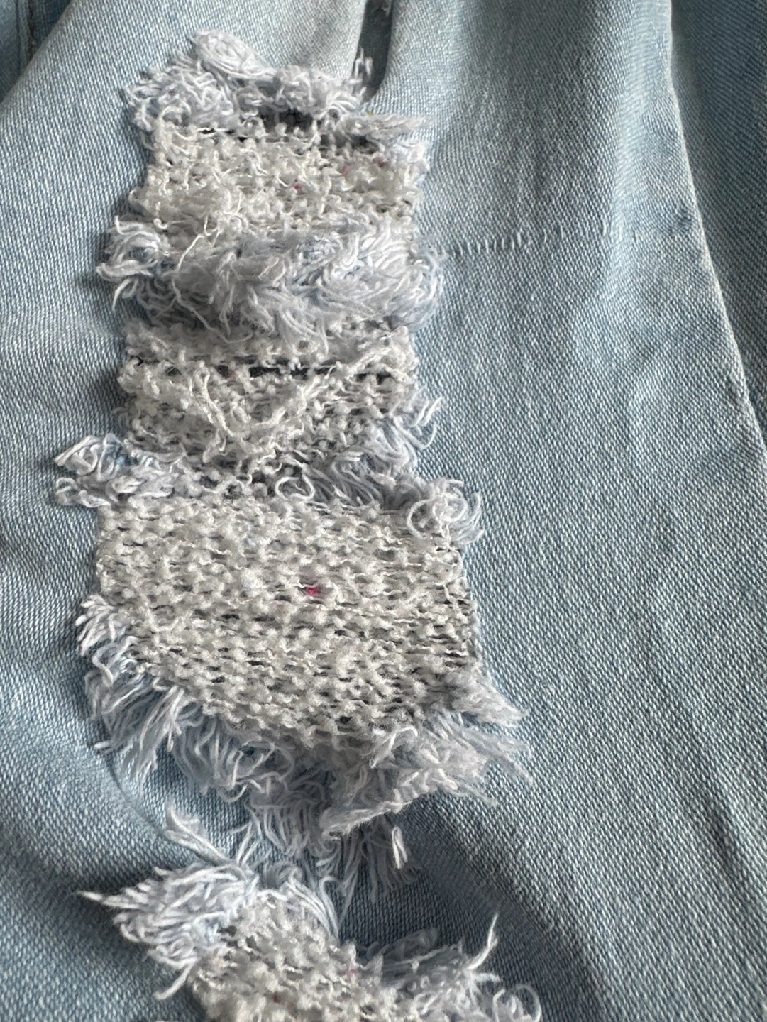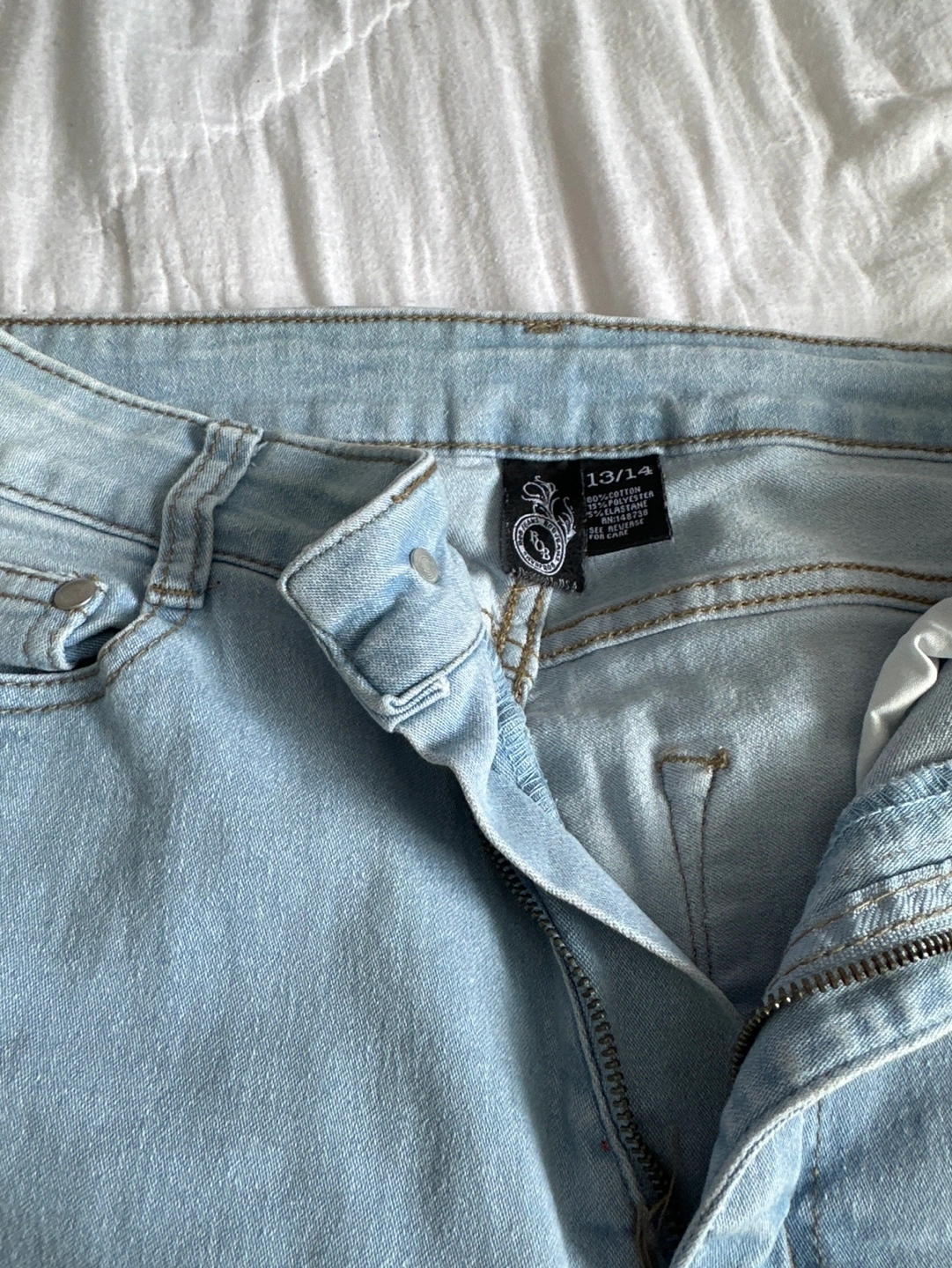 Light wash blue jeans. Distressed detailing throughout. Size 12/14. Straight leg. Stretchy elastic stitching on legs please see photo number four.