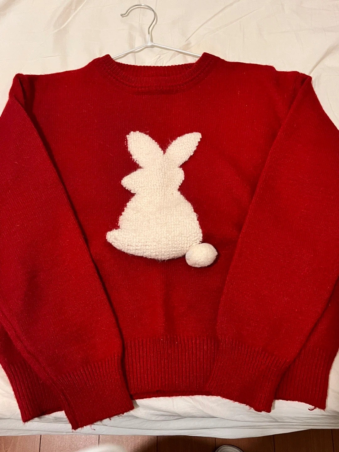 Cozy red sweater with a cute white bunny design! It's in great condition and perfect for adding a touch of whimsy to your wardrobe