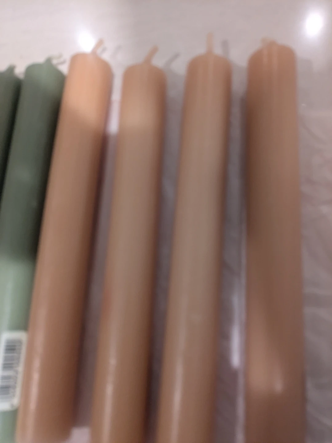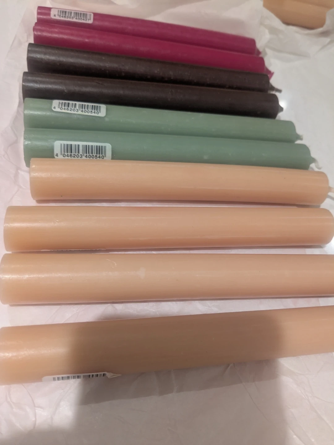 Selling a set of taper candles in assorted colours. There are shades of pink, brown, green and peach. Perfect for adding a touch of warmth to any room