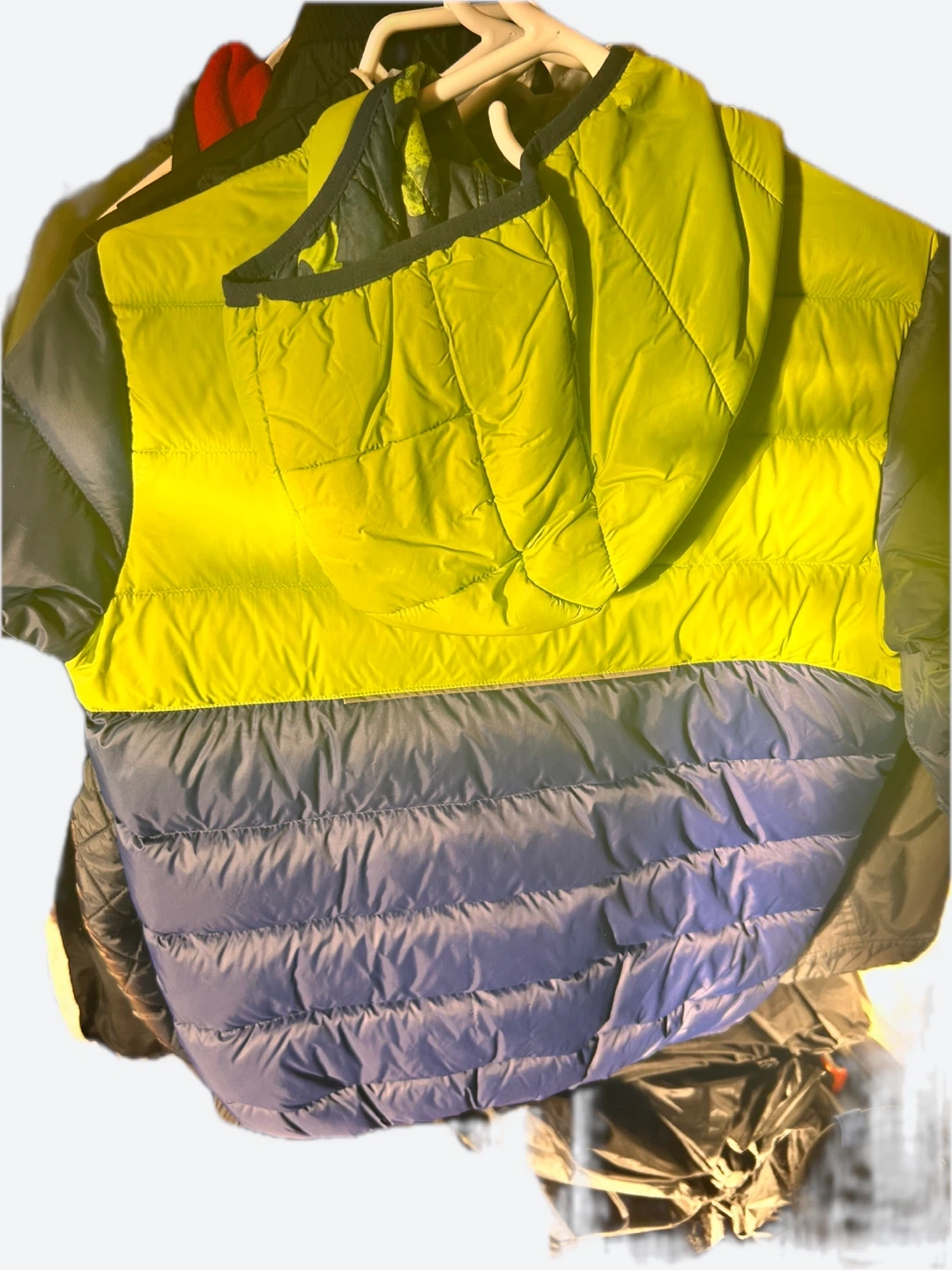 Selling a Land's End puffer jacket in youth size medium. It features a stylish colour block design with yellow, navy, and black. Perfect for keeping warm during the colder months!