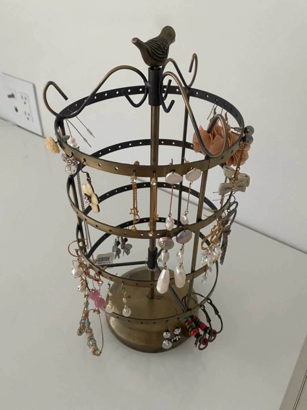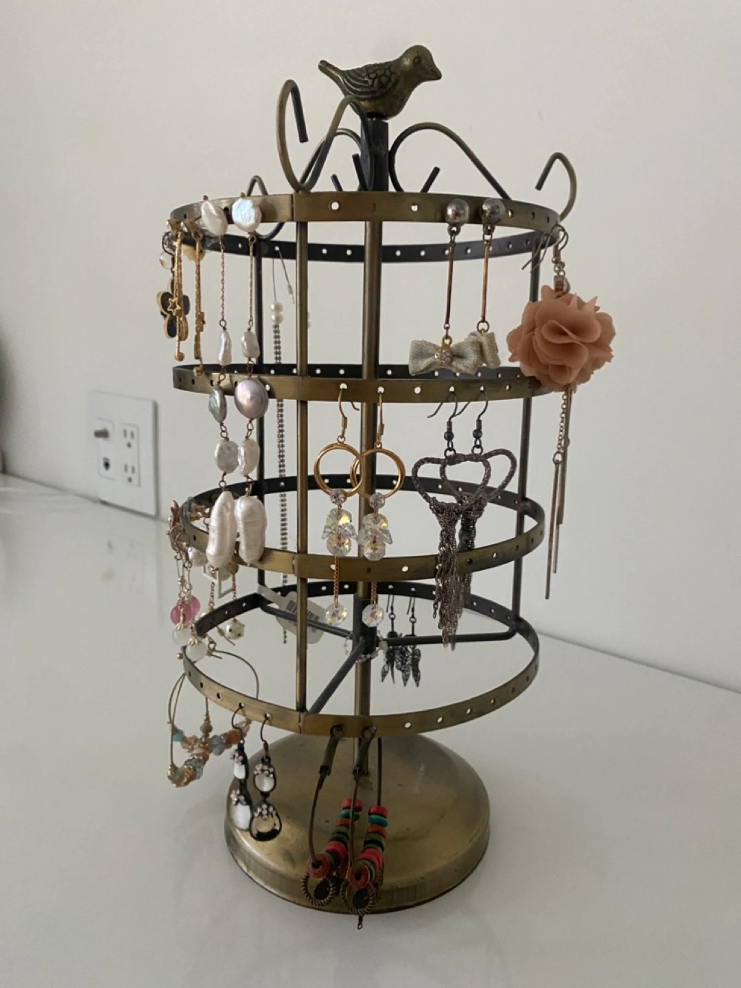 A rotating earring holder display stand. It's perfect for organizing your earrings and other small jewelry items. It features a bird on top and is made of metal with earrings together!