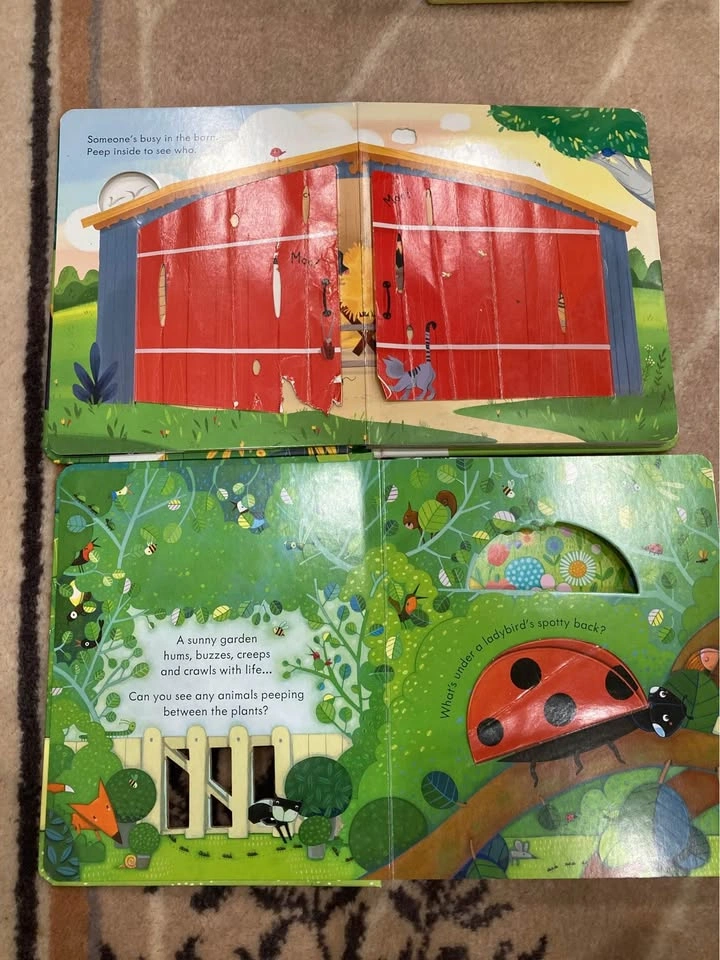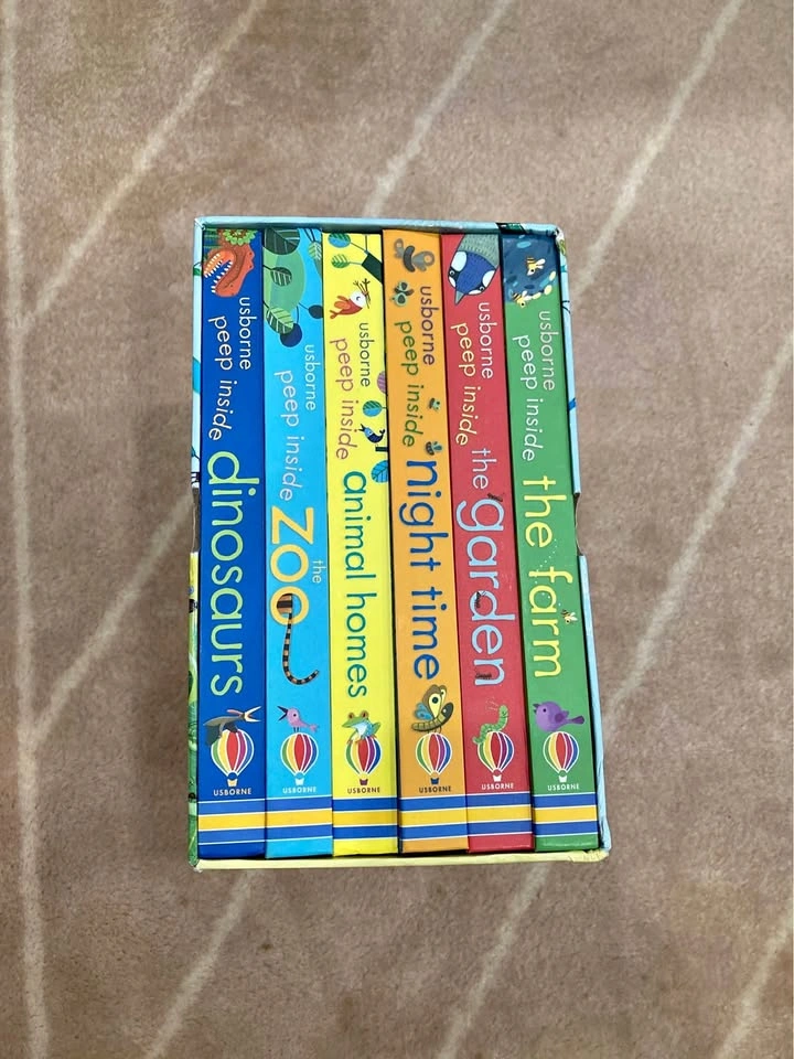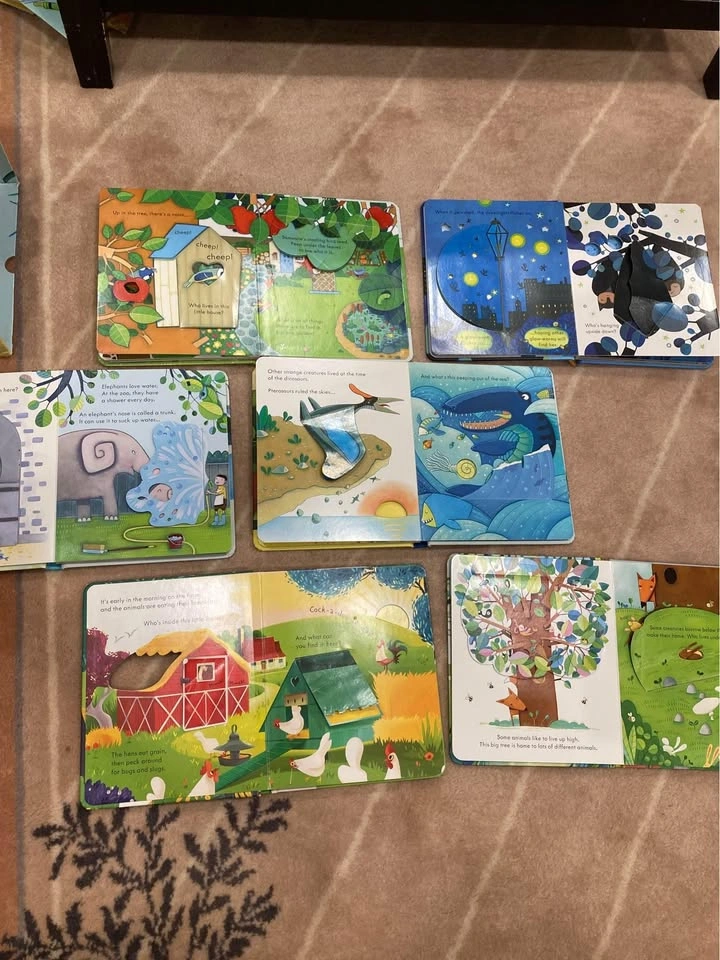 Book titles: Dinosaurs, the Zoo, Animal Homes, the Night Time, the Farm, the Garden. Some flaps are bent or torn as per the photos. Otherwise in good condition.