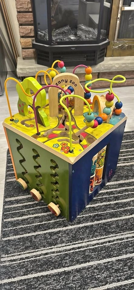 Interactive wooden activity cube! Has a bead maze on top with cute animal friends. Sides have fun zig-zag tracks for sliding, animal flippers like a frog and zebra, and spinning alphabet blocks with pictures. Lots to keep little ones busy!