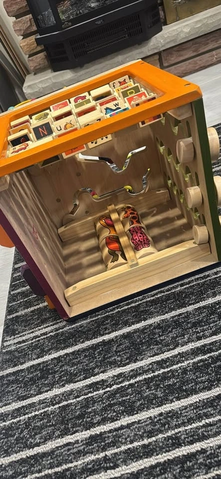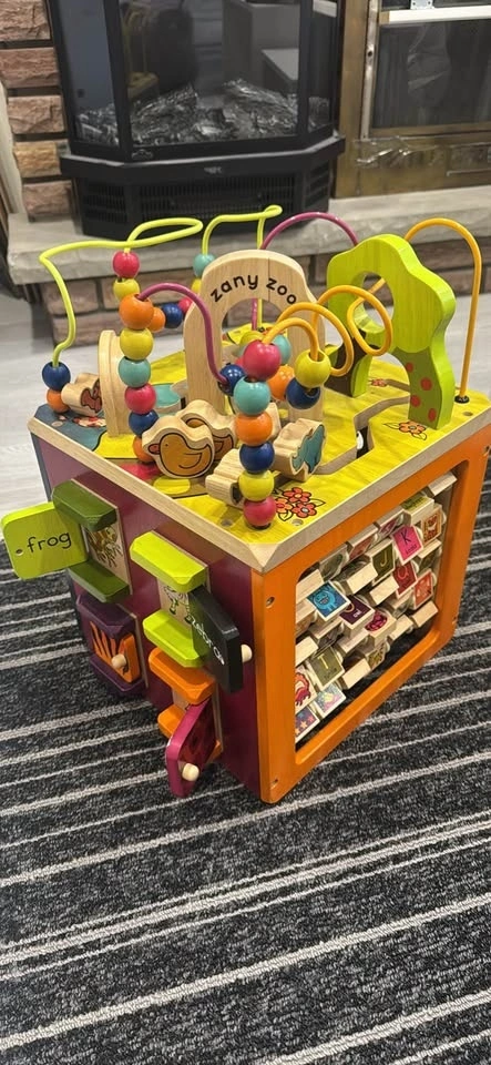 Interactive wooden activity cube! Has a bead maze on top with cute animal friends. Sides have fun zig-zag tracks for sliding, animal flippers like a frog and zebra, and spinning alphabet blocks with pictures. Lots to keep little ones busy!