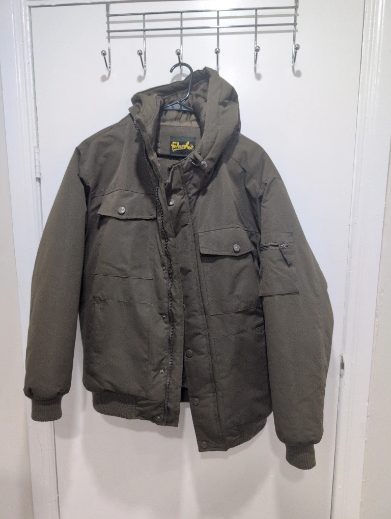 Here's a Fahrenheit winter jacket in olive green. It's in great shape and ready to keep you warm this winter season! only worn 2 months zipper broken but it has snap button and it works fine