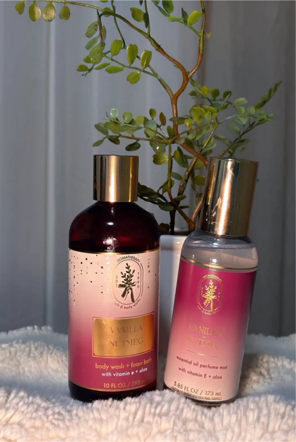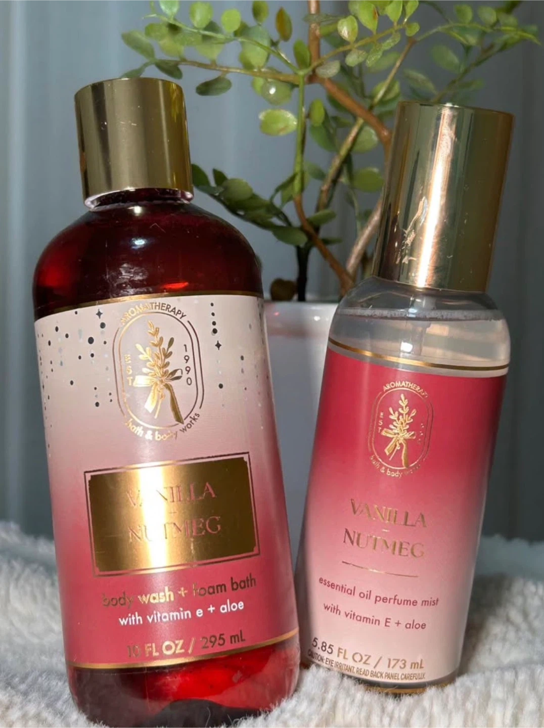 Includes a 10 fl oz (295 ml) body wash + foam bath and a 5.85 fl oz (173 ml) essential oil perfume mist. Both products are infused with vitamin E + aloe. Vanilla Nutmeg scent.