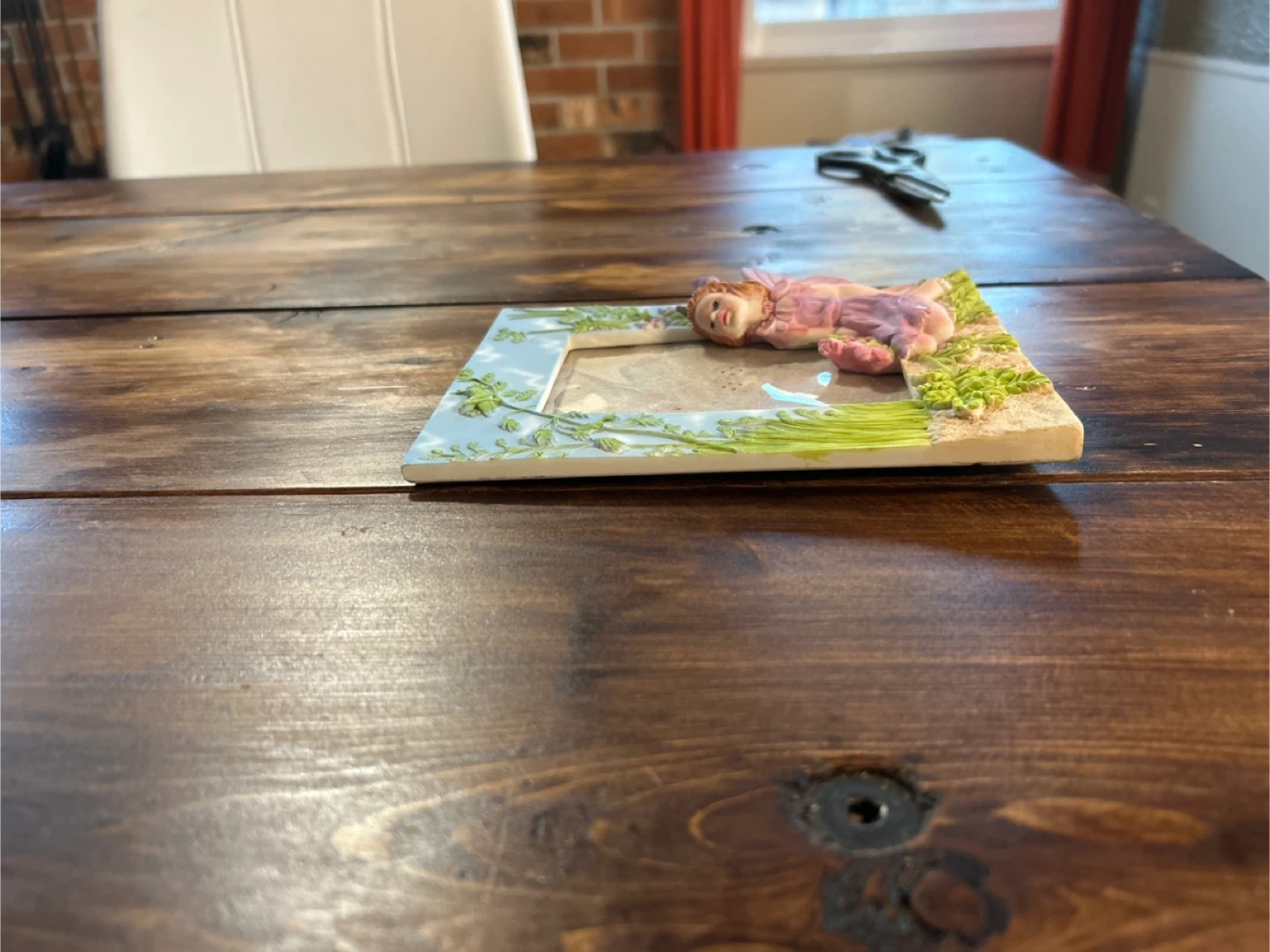 10A cute fairy themed picture frame! It's perfect for adding a touch of whimsy to any room. The frame features a fairy sitting among flowers and greenery. It has a stand on the back so it can sit on a table or shelf