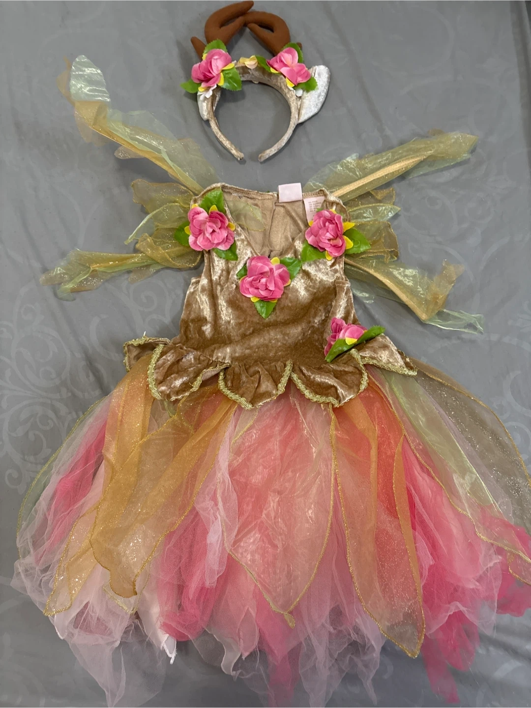 113Adorable fairy princess costume, perfect for dress-up or Halloween! Includes a dress with attached wings and a matching headband with flowers and antlers. The dress features a lovely combination of pink, orange, and gold tones, creating a magical look. It's in great new, unworn without tag and ready for a new adventure!