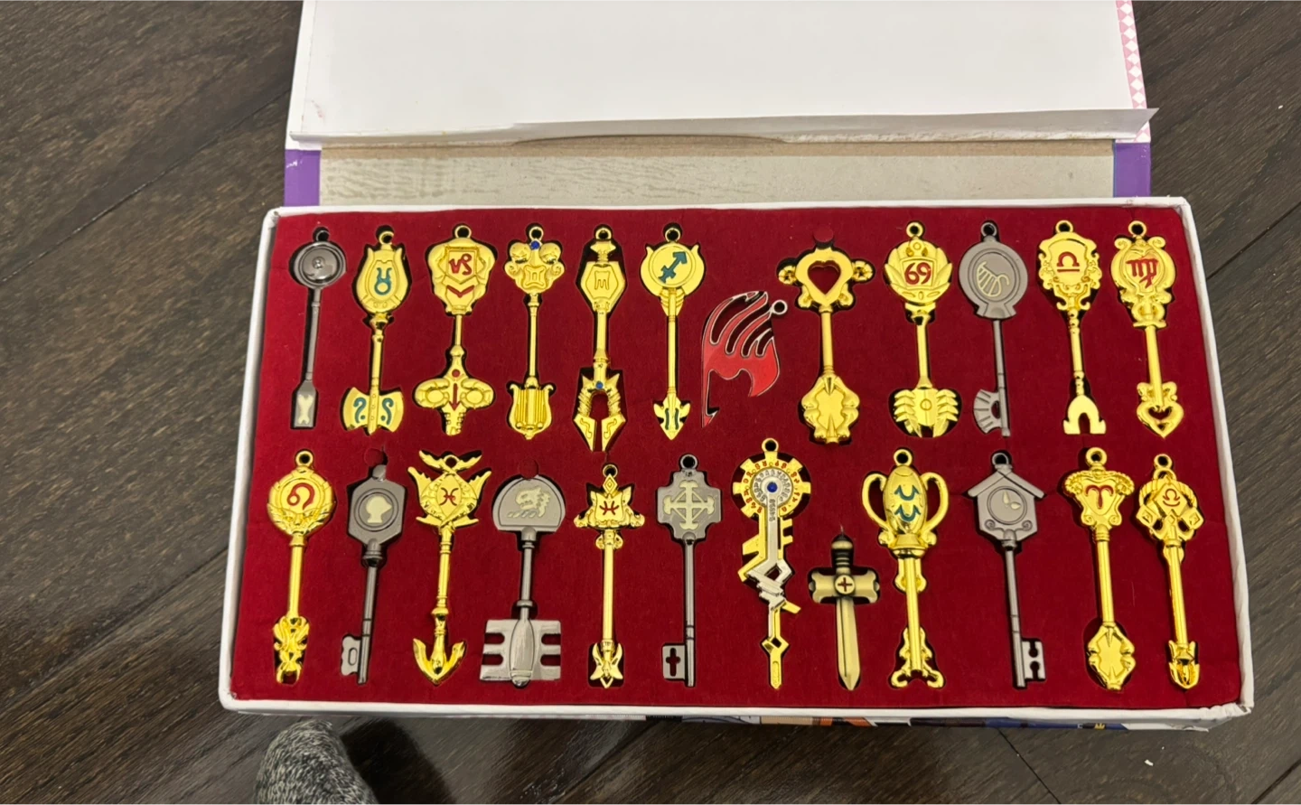 26A complete set of Fairy Tail Zodiac Keys This set comes in its original box and includes all the keys shown in the pictures. ** box is a a bit damaged, but still holds all the keys perfectly.