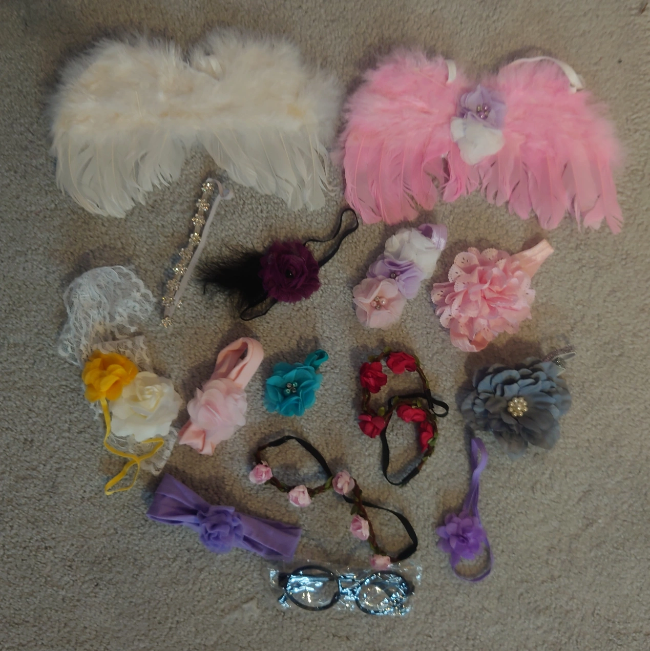 Adorable set of baby headbands, perfect for photoshoots. Includes various colours and styles. Two pairs of feather wings also included. Great for newborn photography.