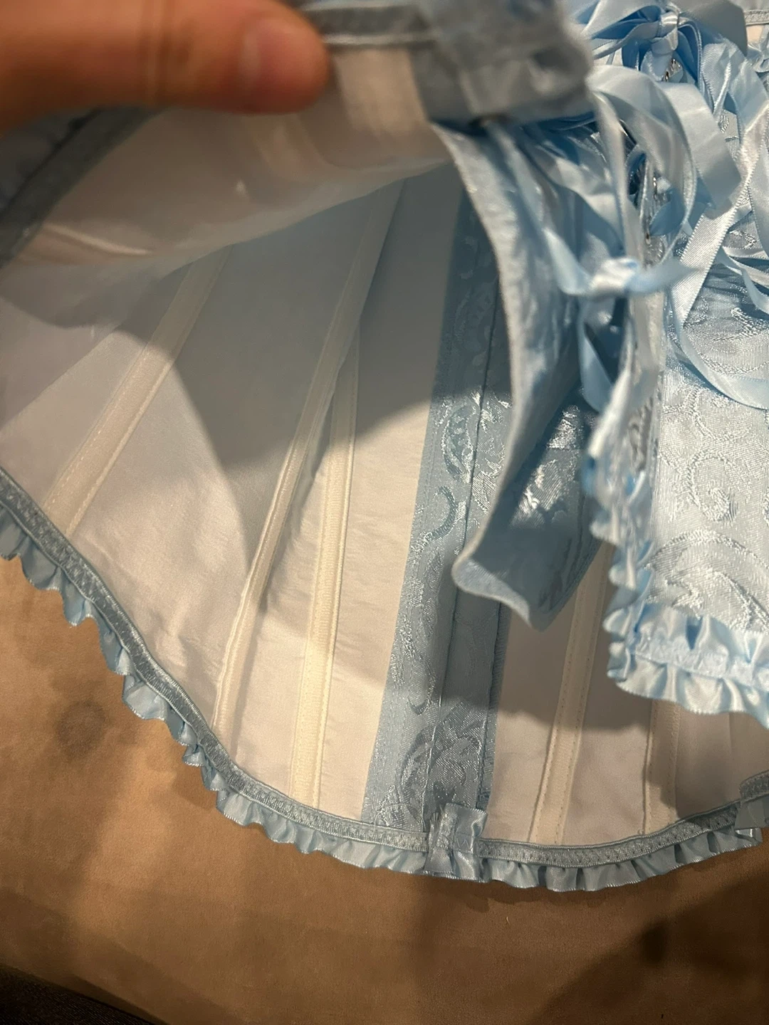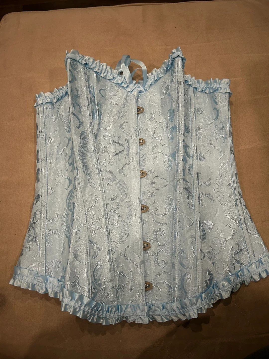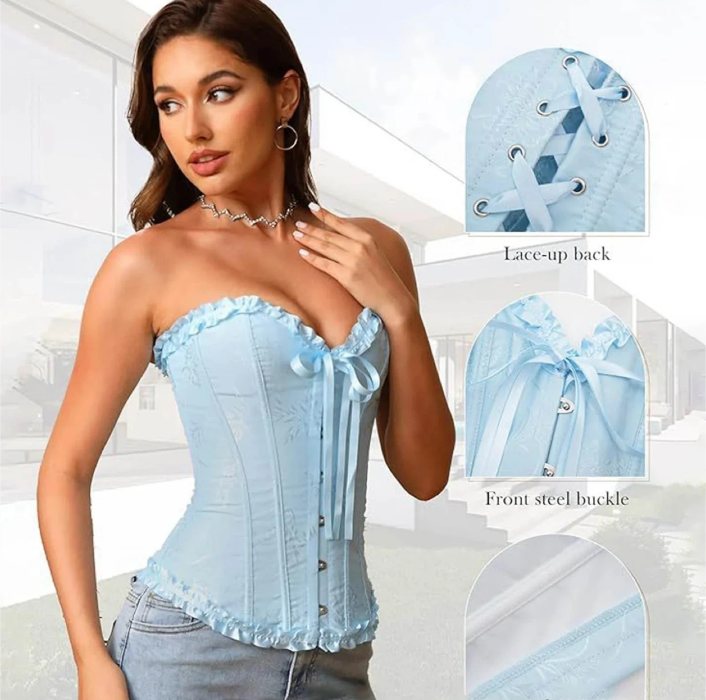 This light blue corset features a damask-style pattern and delicate ruffles along the hem and neckline. It's designed with a lace-up back for adjustable fit and a front steel buckle closure. The interior lining is made of cotton for comfort.