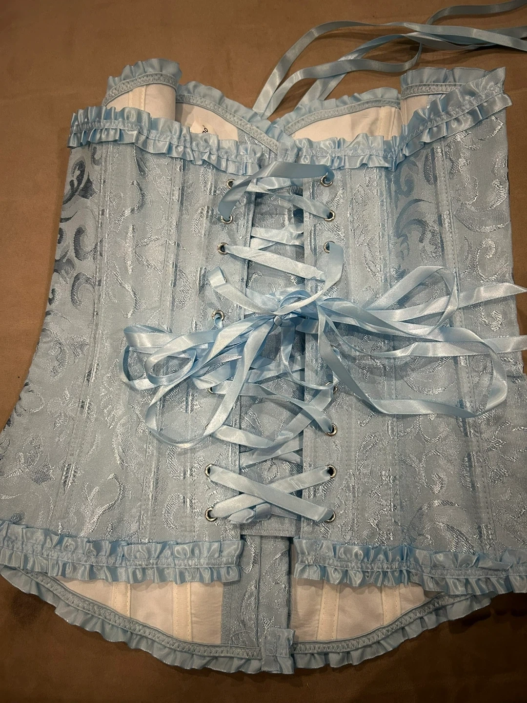 This light blue corset features a damask-style pattern and delicate ruffles along the hem and neckline. It's designed with a lace-up back for adjustable fit and a front steel buckle closure. The interior lining is made of cotton for comfort.