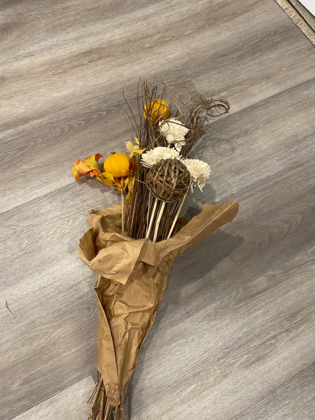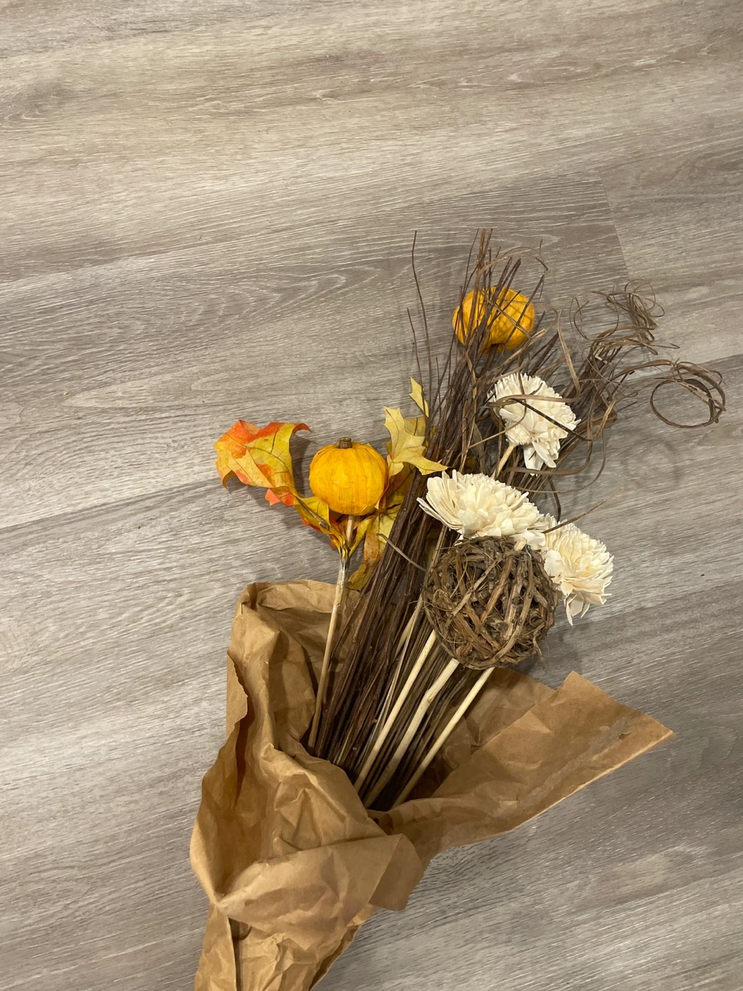 Selling a lovely fall floral arrangement. It features a mix of faux pumpkins, leaves, and neutral-toned flowers. Perfect for adding a touch of autumn to your home!