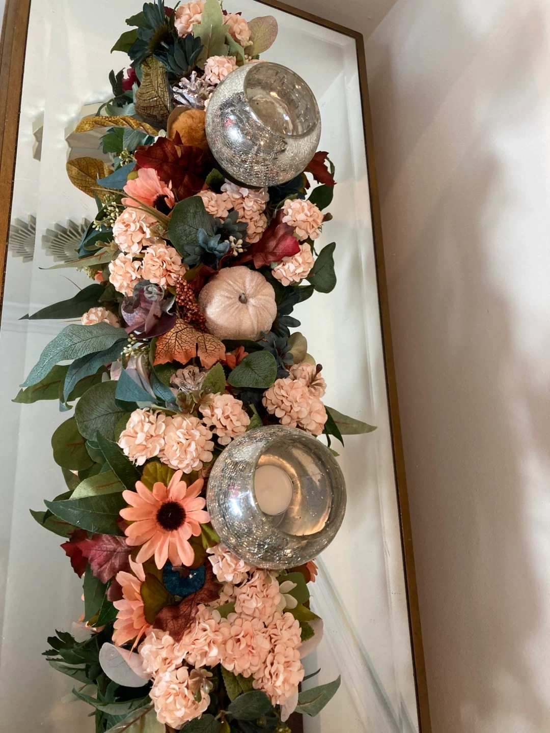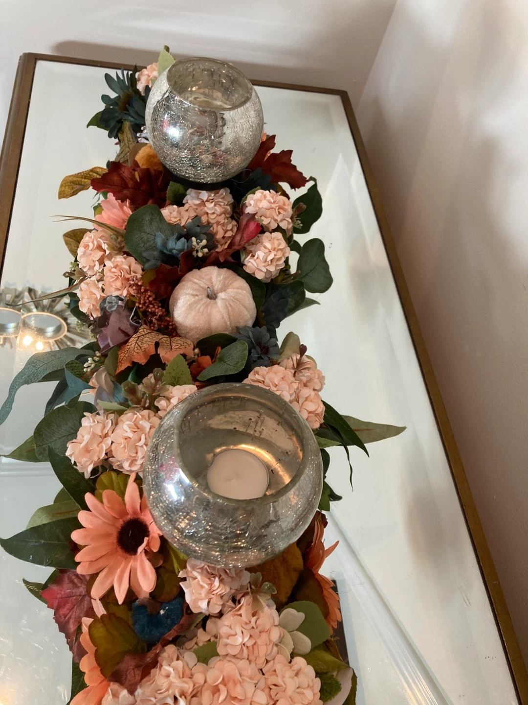 507Add a touch of autumn charm to your home with this beautiful fall floral table runner! It features a mix of faux flowers, leaves in fall colours, and decorative pumpkins. There are also two glass candle holders integrated into the design, perfect for creating a cozy and inviting atmosphere for Thanksgiving or any fall gathering