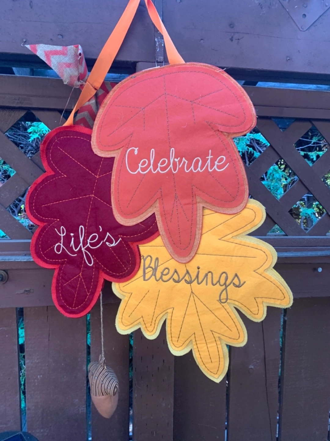 Add a touch of autumn charm to your home with this adorable fall leaf decoration! It features three colourful leaves with the words 'Celebrate', 'Life's', and 'Blessings'.