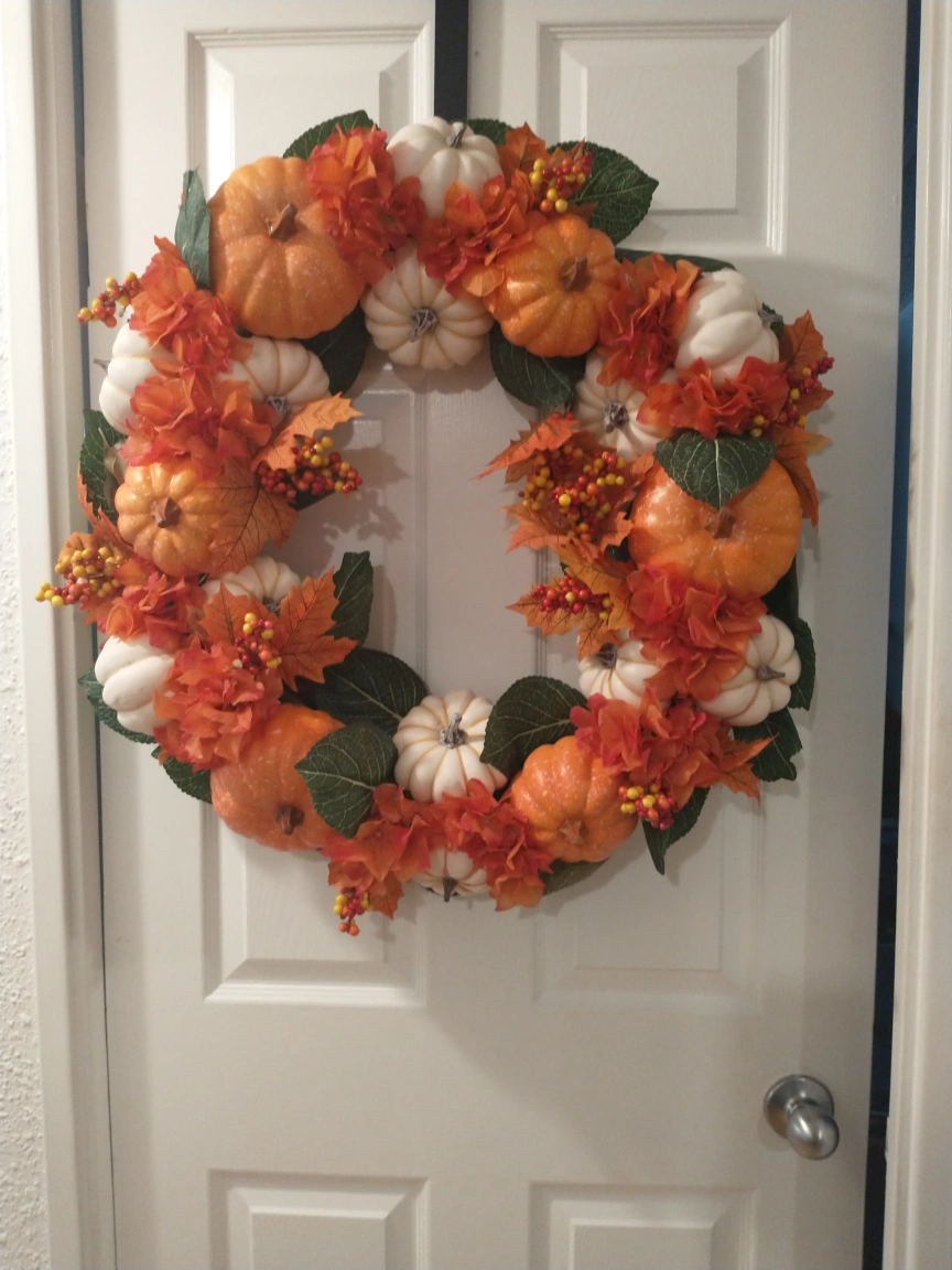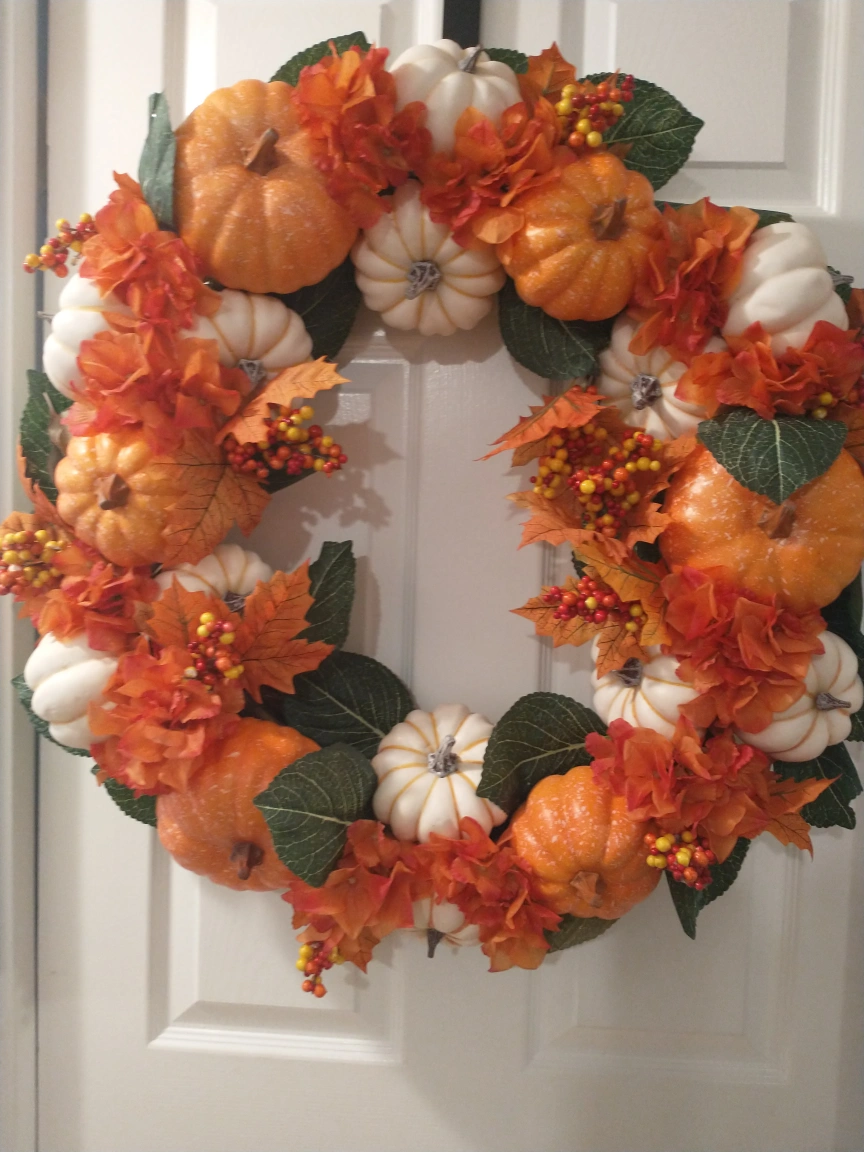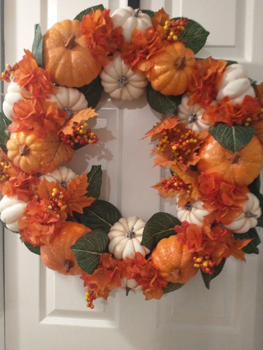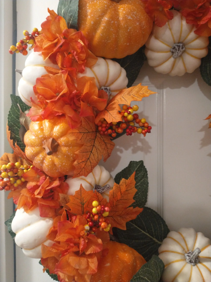 Spruce up your home with this lovely fall-themed pumpkin wreath! It features a mix of orange and white pumpkins, along with colourful leaves and berries, perfect for adding a touch of autumn charm to your door or wall
